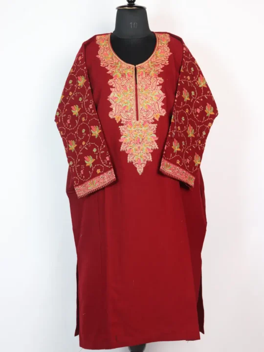 This maroon pheran features badam and floral vine embroidery in magenta, green, mustard threads along the sleeves and neckline. Crafted in cashmilon wool, it offers warmth while keeping the look stylish. A winter piece that holds everyday practicality with an elegant finish.