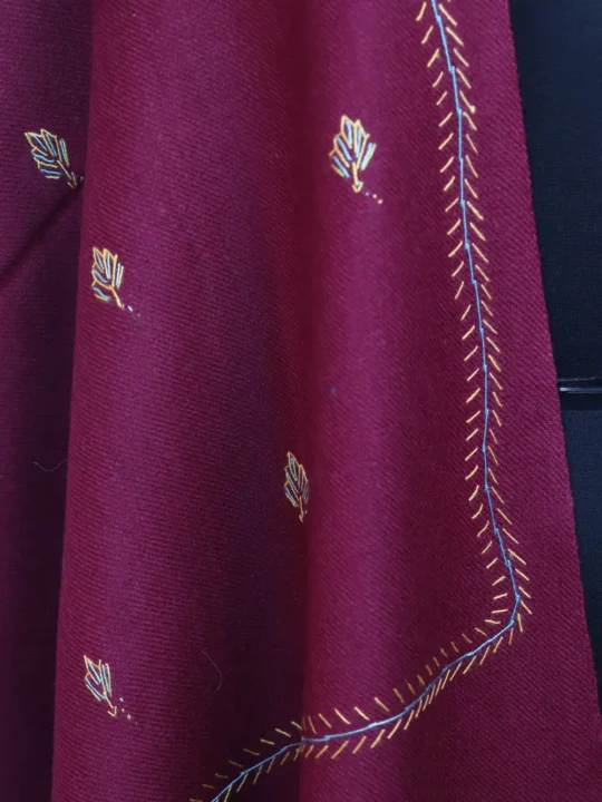 This is a hand sozni shawl made in cashmilon wool, it ool shows continuous border embroidery and floral corner motifs, it has been crafted for women who like refined texture.