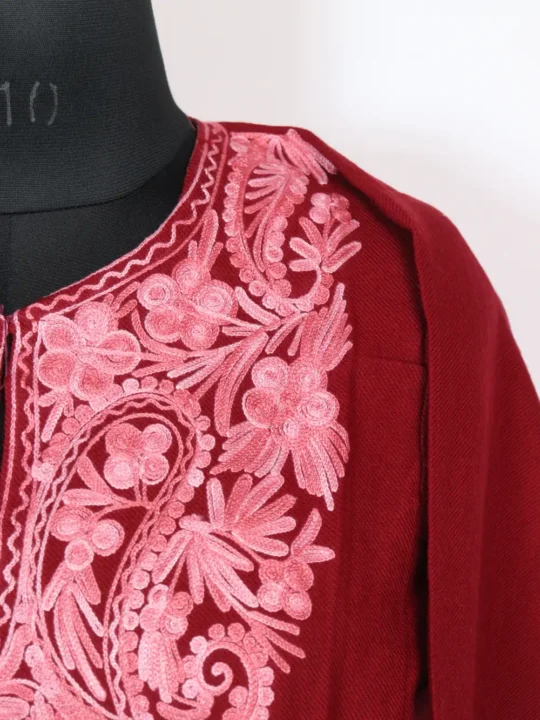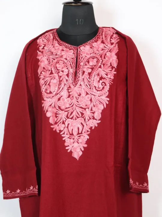 A calm, maroon Cashmilon wool pheran with floral badam Aari at the neckline and prominent floral motifs at the front panel sits in a 47 chest size and 42 length cut. this maroon pheran reads traditional and wearable while showing clear Kashmiri kadhai.