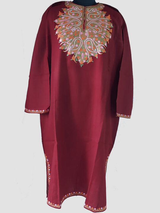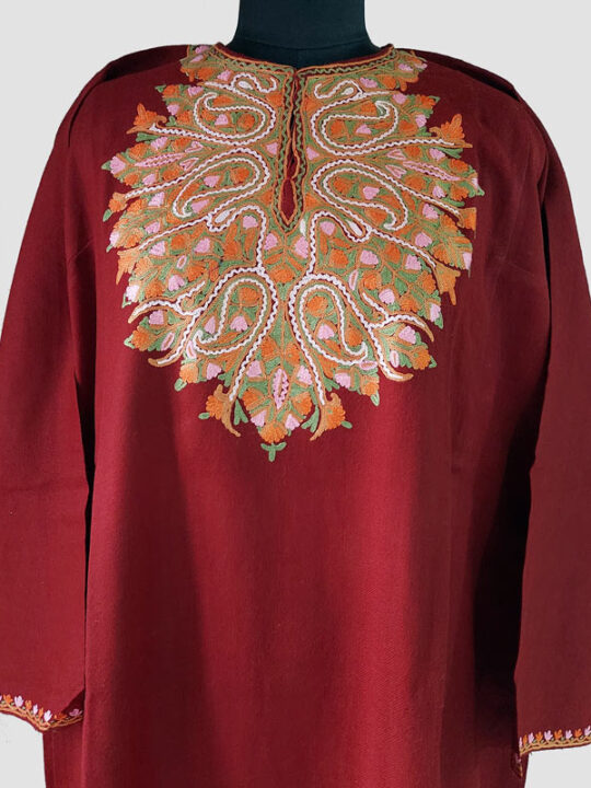 This beautiful Kashmiri winter pheran is made of pure raffal wool. The beautiful and colorful embroidery on it is aari work and is done purely by hand by our artisan.
