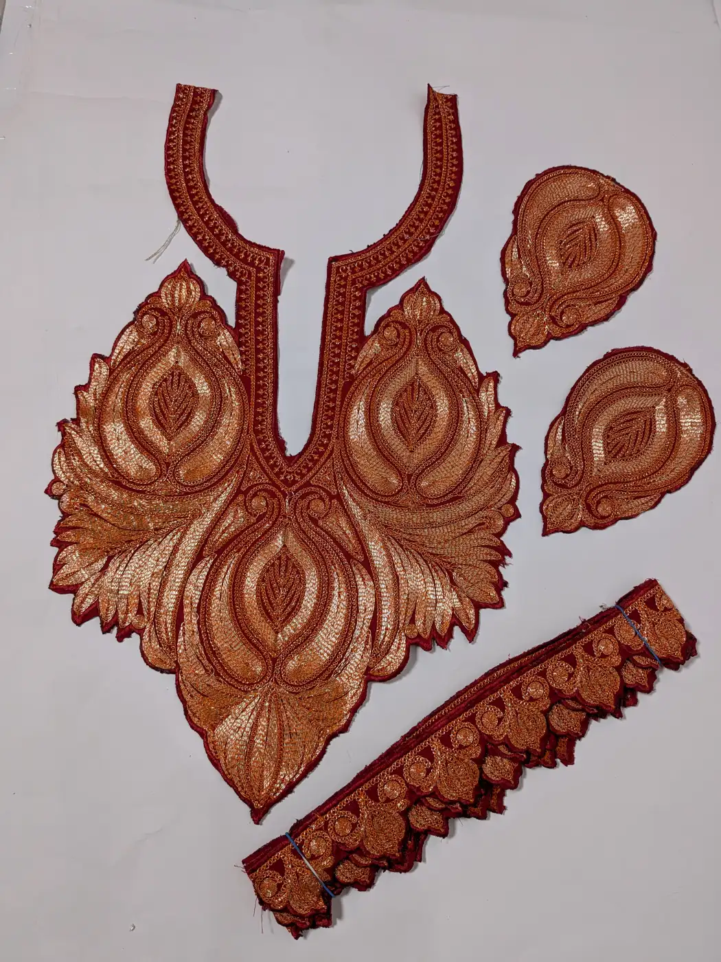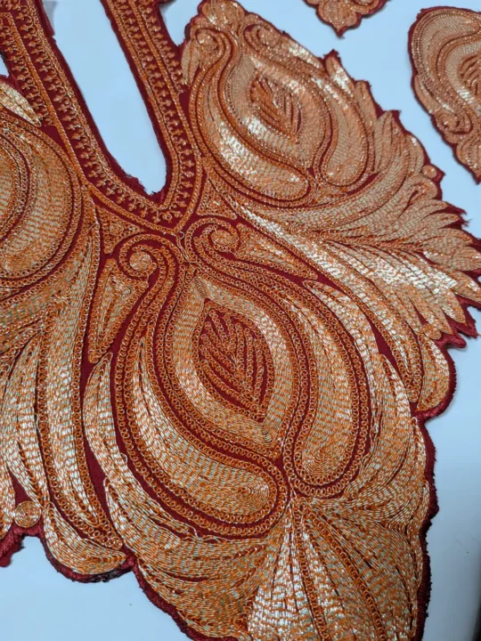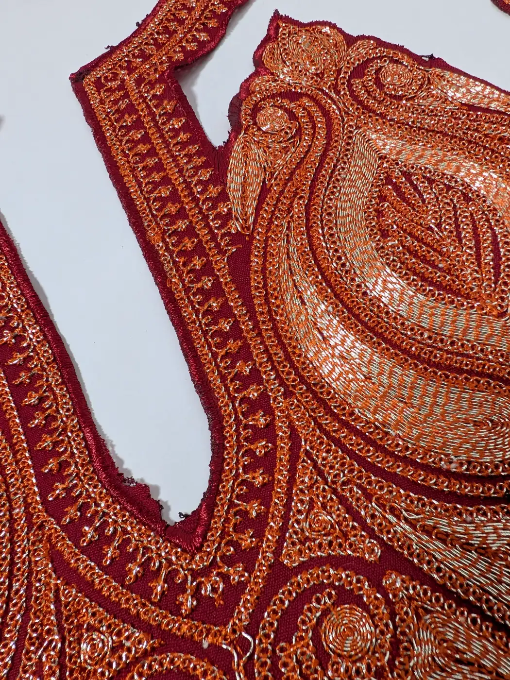 Across the lace, continuous chinar motifs are crafted in golden tilla embroidery, while the sleeve patches and neckline are filled with floral and paisley designs. This maroon patch reflects detailed Kashmiri craftsmanship with a balanced and traditional decorative layout.