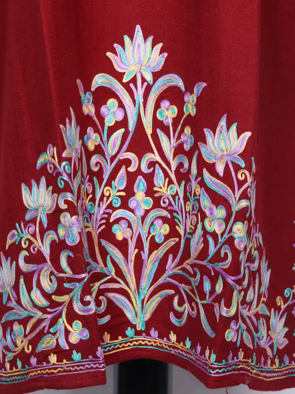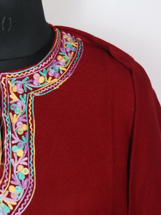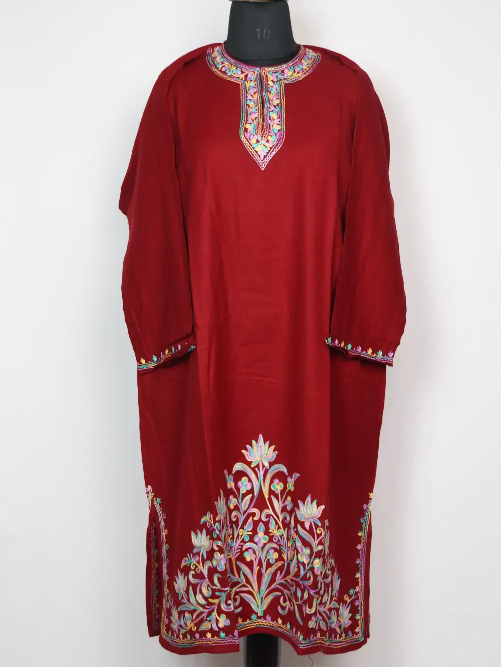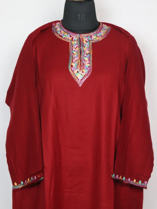 Made in cashmilon, this rekhta feran highlights the neckline with subtle aari kadhai with detailed floral work at the bottom area. It comes with two side pockets that add to its practicality.