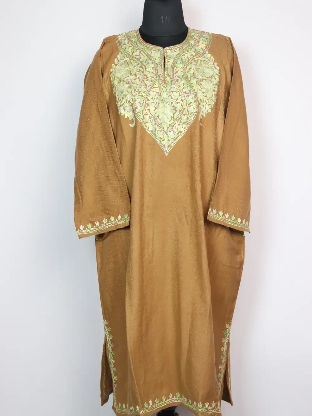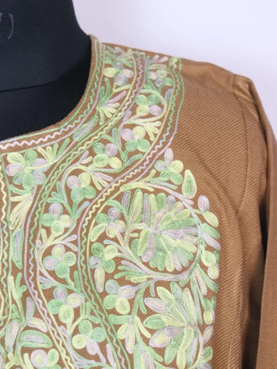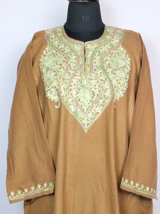This pheran blends comfort with culture, with beautiful floral aari embroidery around the neckline.
