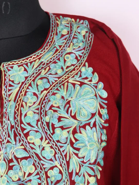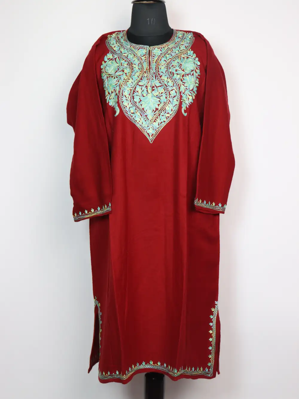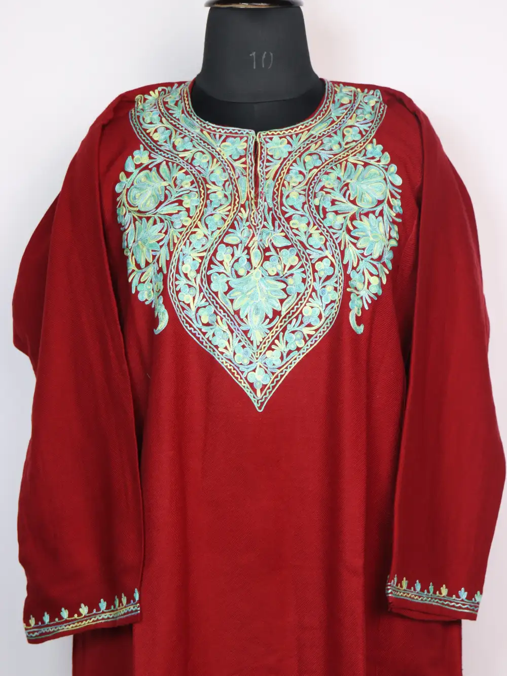 This Cashmilon wool pheran has a touch of Kashmiri tradition with Aari floral kadhai around the neckline which adds to its beauty.