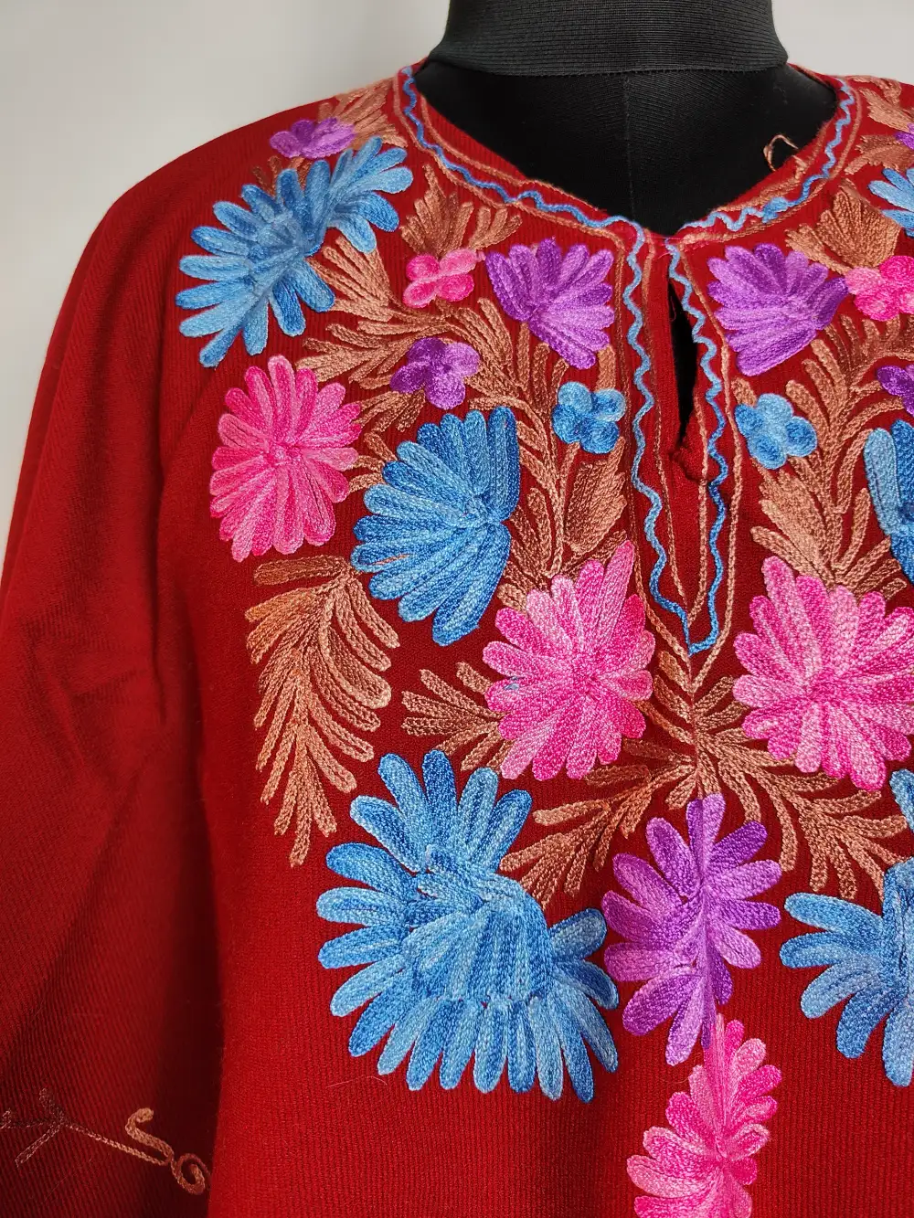 Woven in Cashmilon wool, this kashmiri maroon poncho dress shows floral Aari at the neckline and continuous embroidery near the border. Side-by-side it measures 66 inches and length is 31 inches.