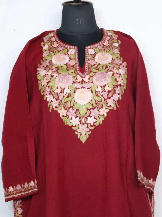 Styled using raffal wool for winter needs, this pheran design comes in maroon colour. It features floral aari embroidery which is placed at neckline.