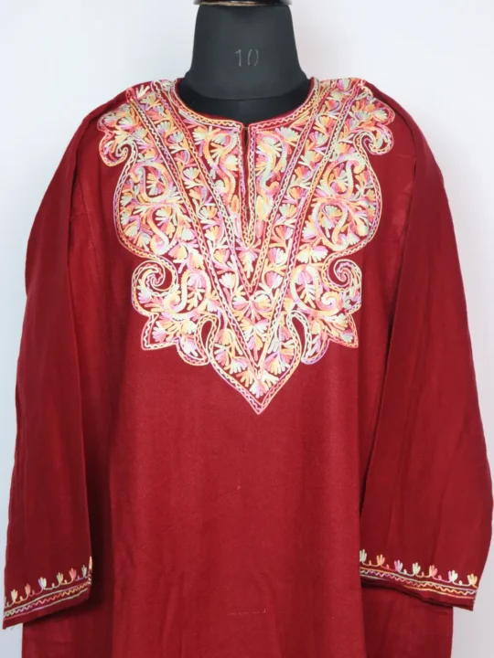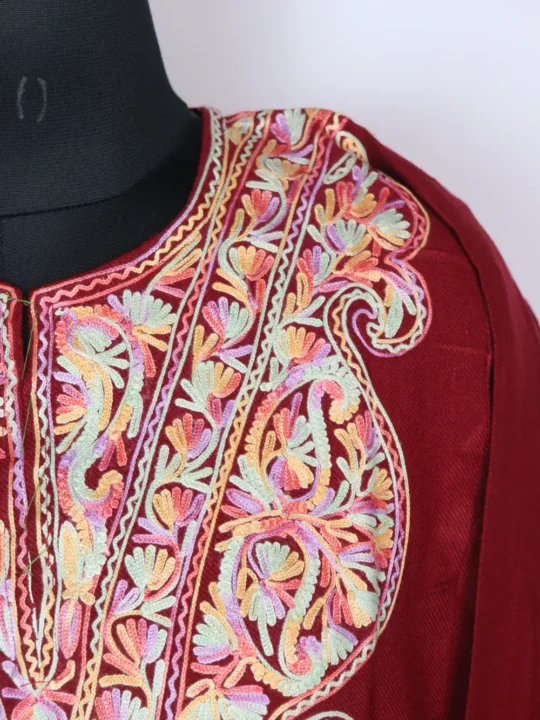 Crafted in cashmilon wool, this Kashmiri feran wraps gently with floral Aari embroidery centered on the neckline. Its chest size 50 and length 44 inches keeps it easy-fitting and season-friendly.