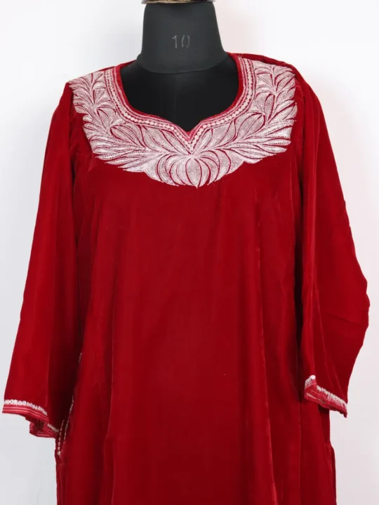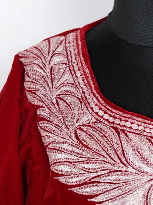 Elegant and cozy, this maroon Kashmiri Pheran features Makmal (Velvet) fabric with silver tilla embroidery at the neckline. Two side pockets enhance its practicality while the 50-inch chest and 45-inch length offer a relaxed fit. This Pheran blends warmth with intricate detailing, which makes it perfect for winter layering. It is a soft, stylish pick, this garment is also ideal as a kashmiri phiran female staple.