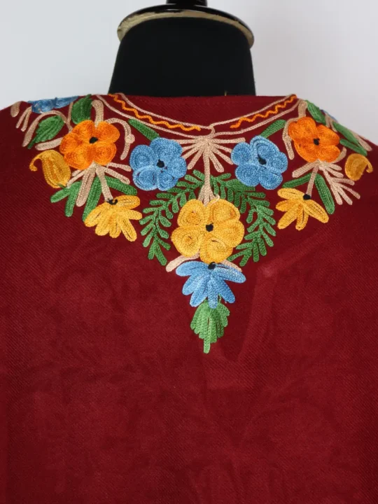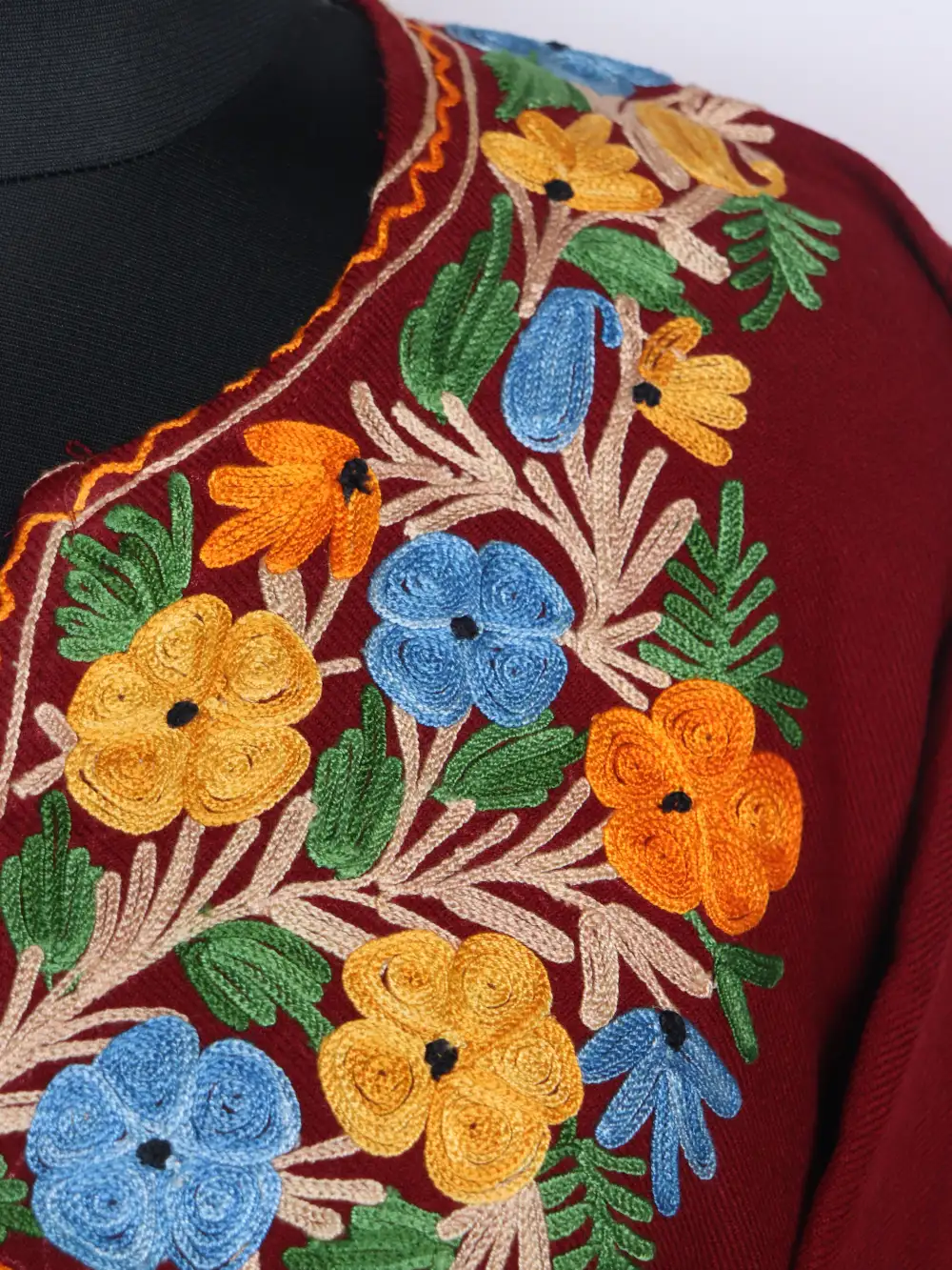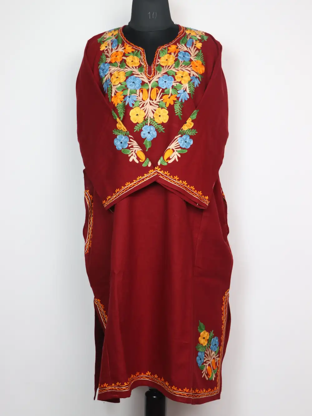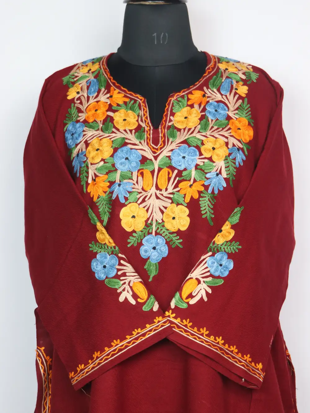 Cashmilon wool phiran dress in maroon colour displays elegant floral aari embroidery at the front back neckline, sleeves and daman corners. It has chest size 54 inches and length 43 that offer cozy fit.