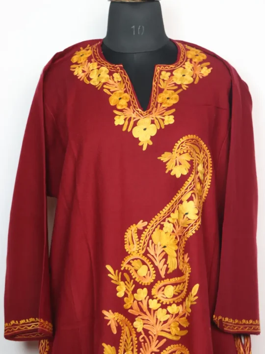 A classic cashmilon wool pheran with elegant aari embroidery. The neckline is well defined with floral motifs, and the front panel features a continuous floral and badam design that adds classic touch to this beautiful firan.