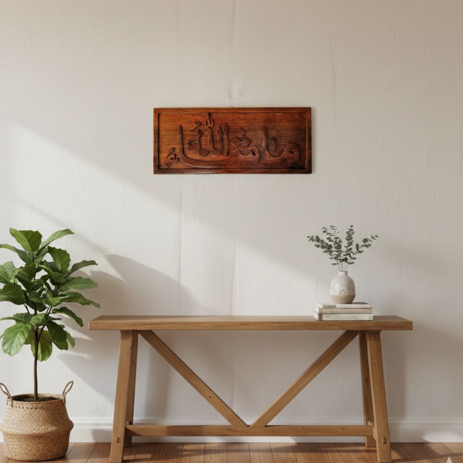 This beautifully hand carved frame from India is handcrafted from rich walnut wood and it carries the phrase “Ma Sha Allah” in Arabic which is delicately inscribed using traditional Kashmiri carving techniques. It is measuring 18 by 7.5 inches, it brings a graceful, spiritual presence to your space — the kind that quietly reflects both reverence and craftsmanship.