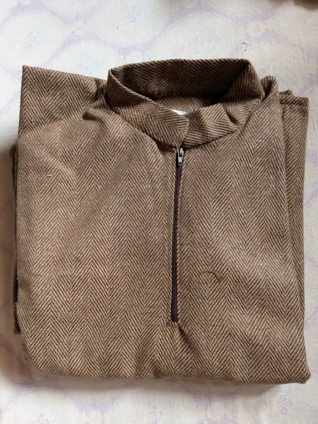 This medium brown tweed pheran is designed for warmth and style, with a beautiful cut that makes it ideal for winter. It is a perfect blend of Kashmiri heritage and comfort.