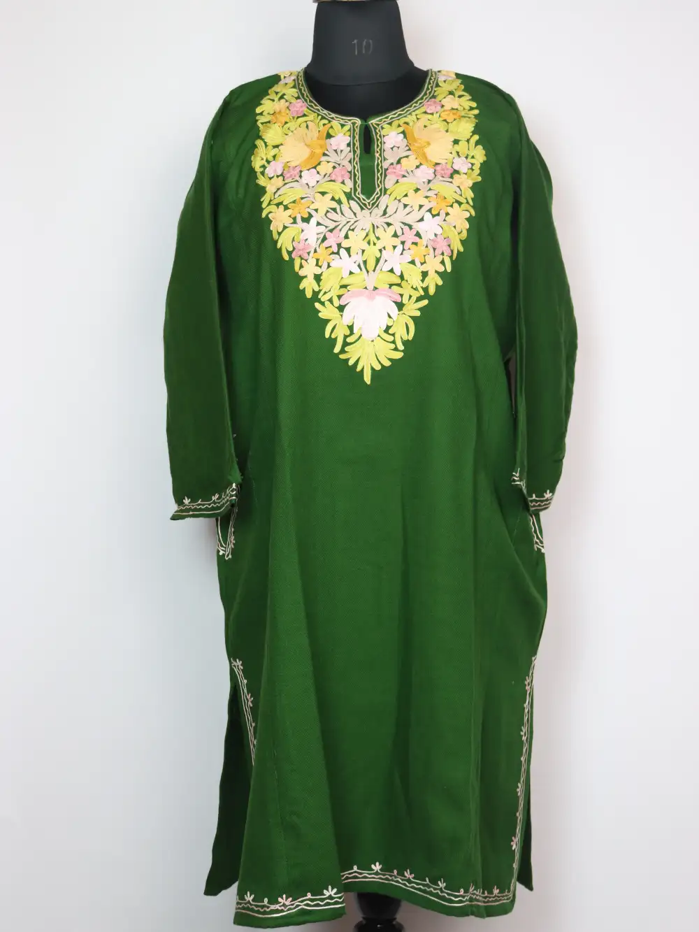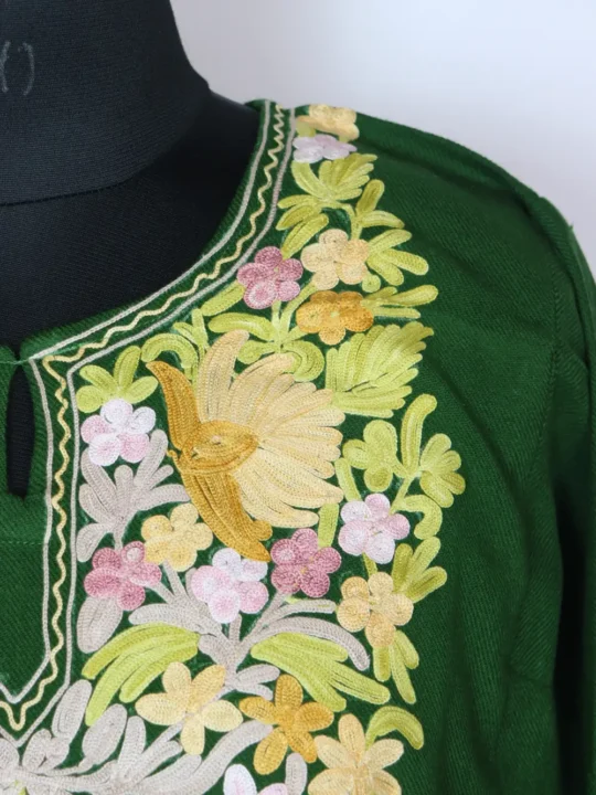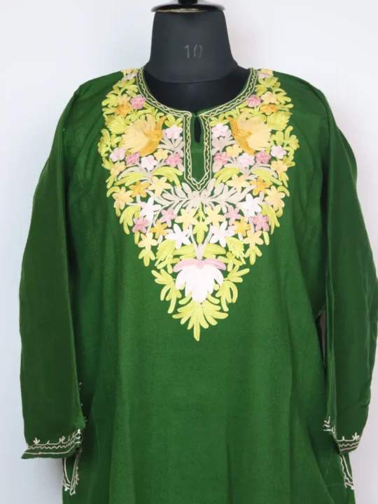 Comfortable kashmiri phiran crafted from Cashmilon wool features floral aari kadhai detailing at neckline with pockets on both sides that add utility.