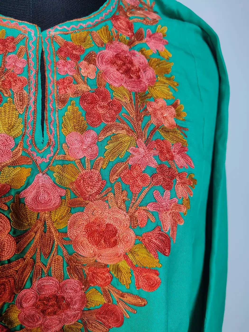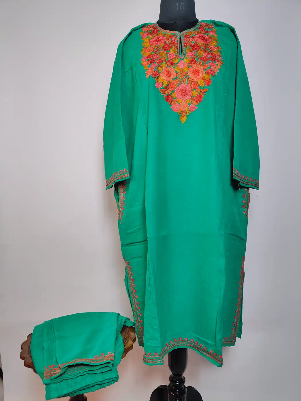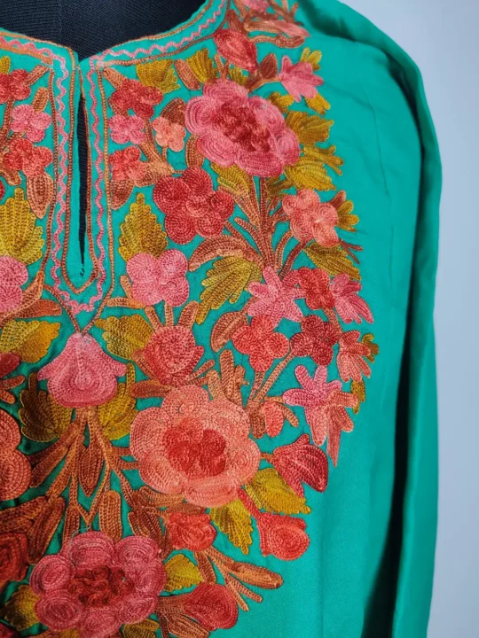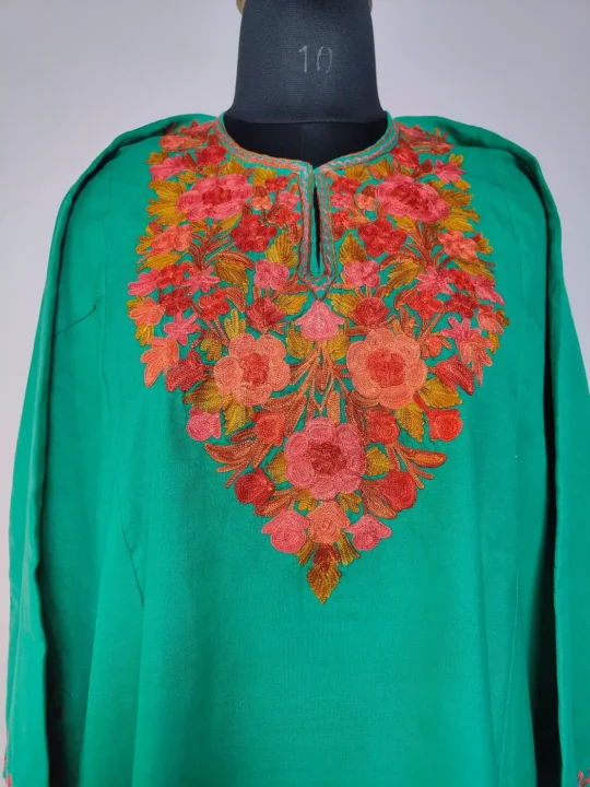 Made in summer cool cotton for daily comfort, this green colour kashmiri kurta set features Kashmiri aari embroidery at neckline in floral motifs. It includes kurti and trouser. It comes in 50 inches chest size and 43 inches length which makes it graceful wear.