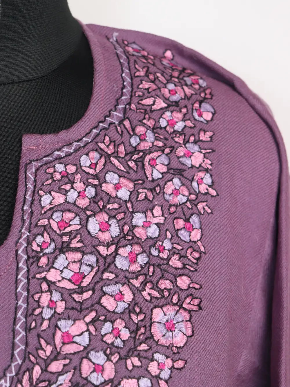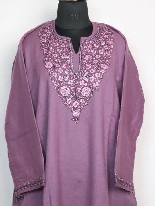 Soft Raffal Wool in purple hue shapes this stylish Kashmiri pheran, it has been adorned with Sozni and paper machie embroidery at the neckline in floral motifs. It comes with chest size 54 inches and length 43 inches that gives a roomy, graceful fall.