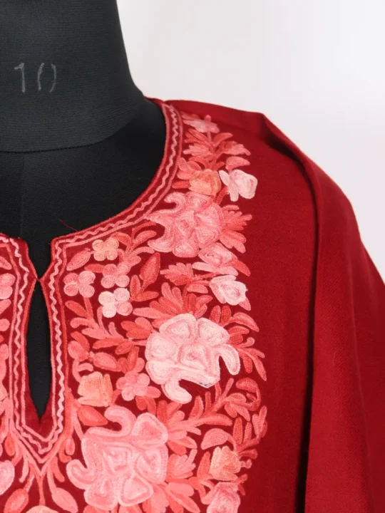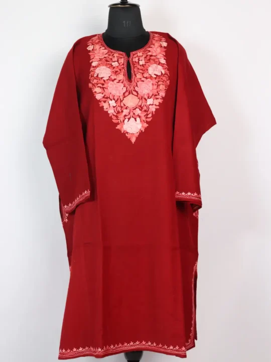 Soft maroon Raffal wool gives the mehnaz pheran warmth for winter layering. Pink and dark red floral Aari embroidery adorns its neckline, creating subtle elegance. Measuring 40 inches in length with a 40-inch chest, this phiran drapes lightly and allows easy layering. It has pockets on both sides which add practicality, while at ₹2499, this feran combines refined detailing and cozy comfort, that makes it a versatile winter essential.