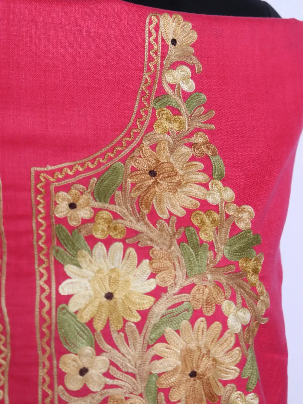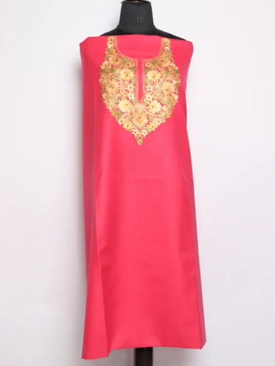 Ruby cotton lends this pink color unstitched 2pc suit a soft, breathable quality. The neckline carries Aari embroidery in which florals stitched in mustard tones are paired beautifully with green-threaded leaves. This combination creates a refined highlight without overwhelming the garment. Its fabric flows easily, which gives you the freedom to tailor it to your own fit, makes it as practical as it is elegant.