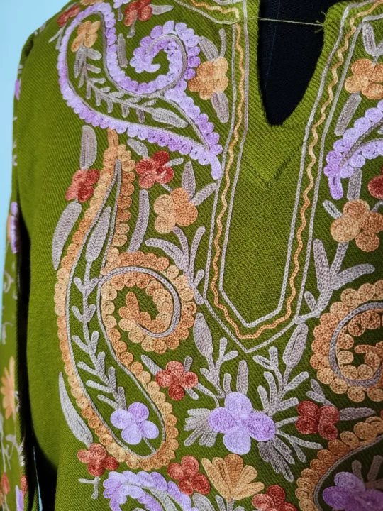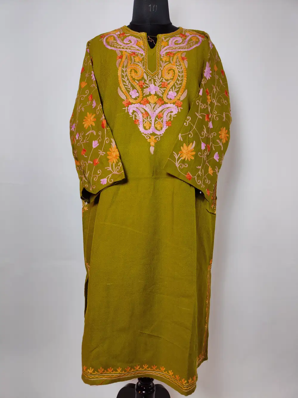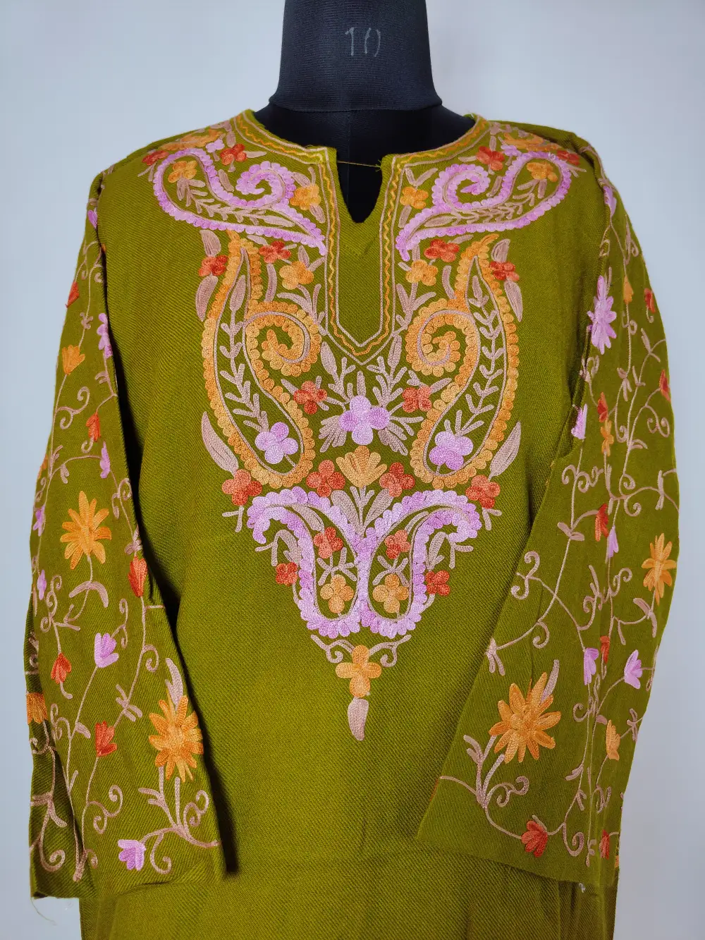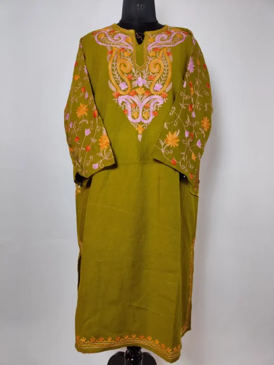 Designed for winter ease, this mehndi green cashmilon wool pheran carries the charm of Aari embroidery. Purple, brown huge badam motifs at neckline and heavy vine pattern all over the sleeves create a gentle highlight, turning this simple garment into a graceful winter essential. Its soft drape and light warmth make it a favorite for everyday use. It is ideal for women who want their daily wear to be cozy yet beautiful.