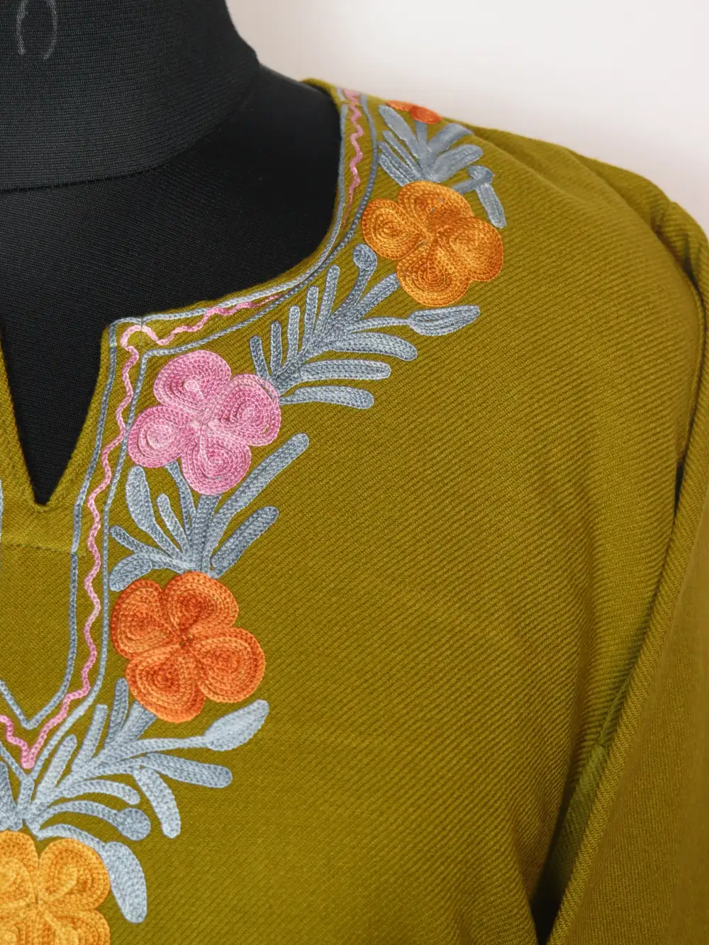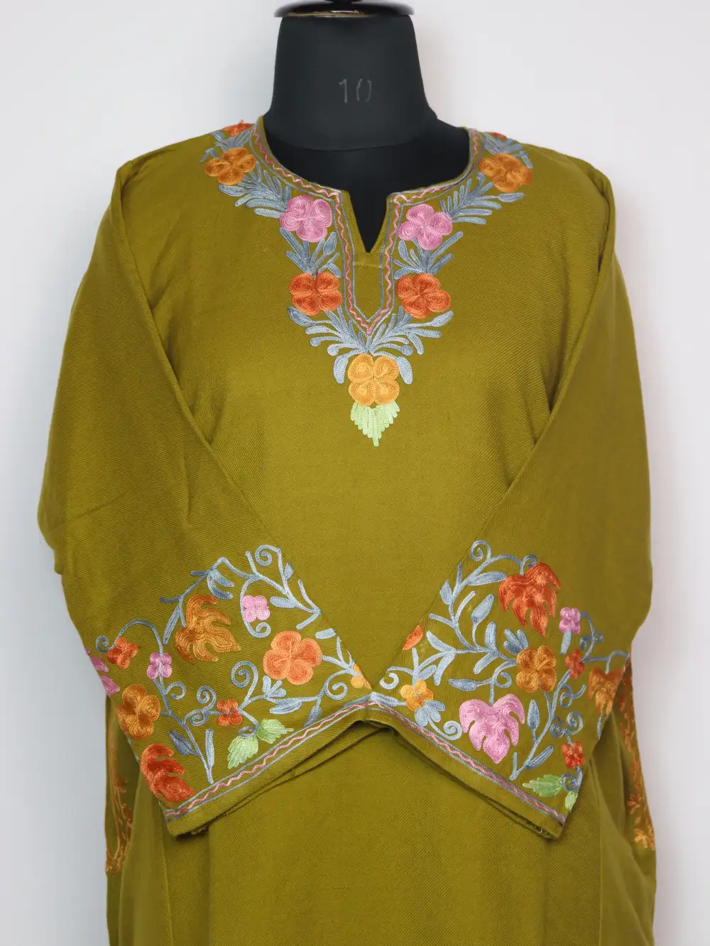 Made using cashmilon wool to retain warmth, kashmiri faran appears in mehndi green colour. It displays aari embroidery with floral work across neckline, sleeves and border.