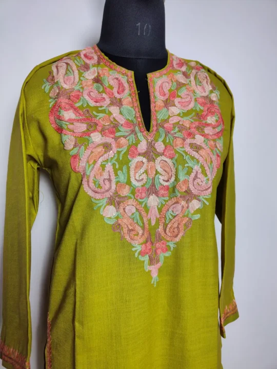 Made in mehndi green ruby cotton, this co-ord set carries Kashmiri warmth using a well-matched kurti and trouser. Its floral aari embroidery adds detail to the neckline.