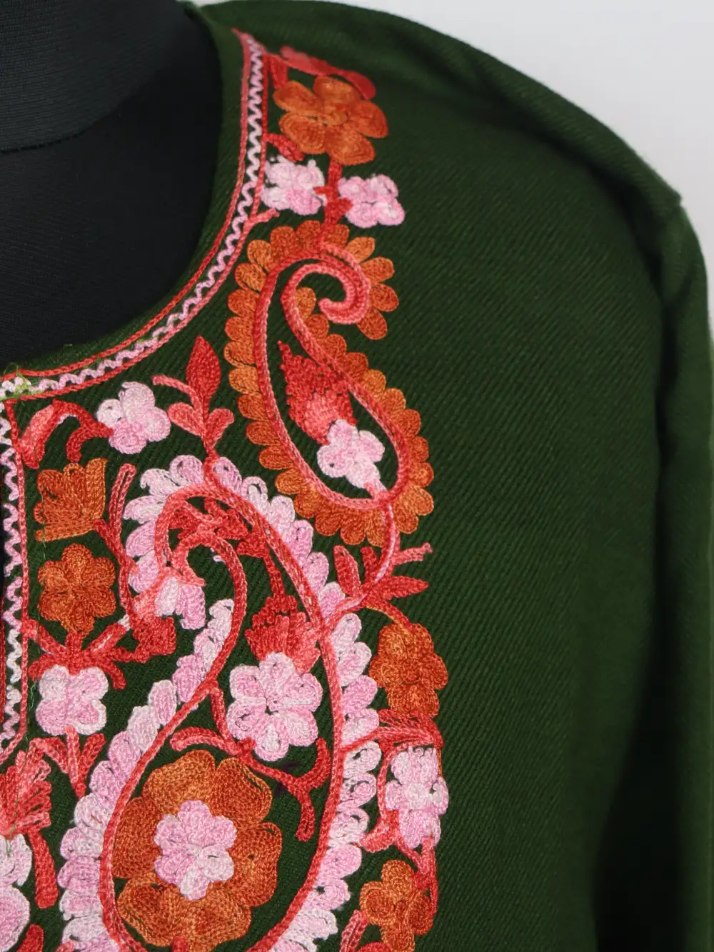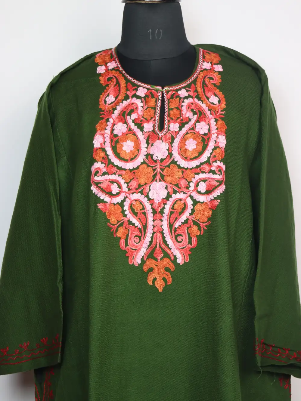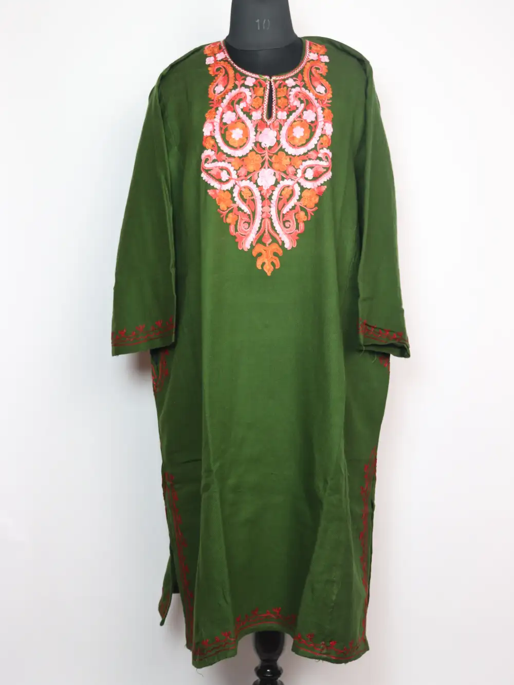 A stylish mehndi green Kashmiri pheran, crafted in cashmilon wool, warmed with aari embroidery at the neckline in badam and floral motifs. Its chest size 52 inches and length 48 inches shape its easy drape.