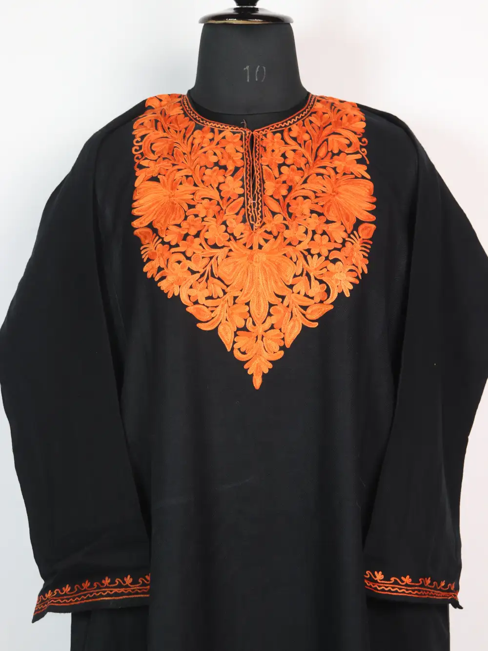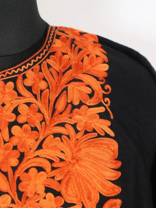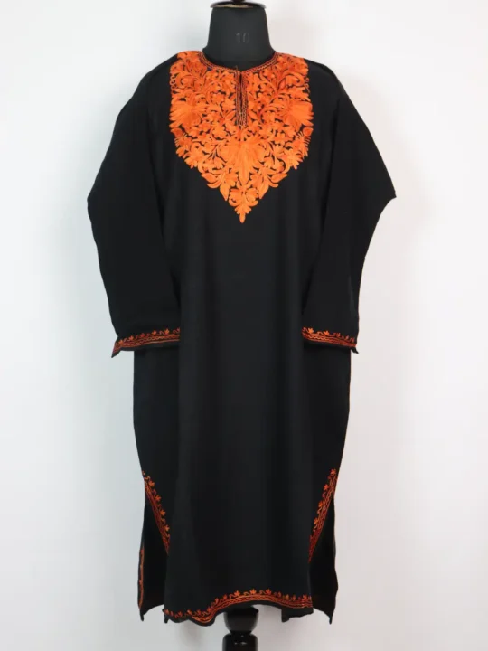 Priced at ₹1499, this black pheran is made from Cashmilon wool, it ensures cozy winter comfort. Mustard floral Aari embroidery decorates the neckline beautifully, which has given it an elegant accent. Measuring 44 inches in length, this pheran fits easily over any base layer. With a 50-inch chest, it drapes lightly while retaining warmth. This phiran is a practical yet refined winter layer for casual or home wear.