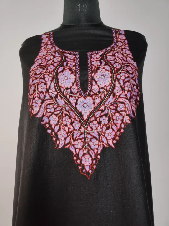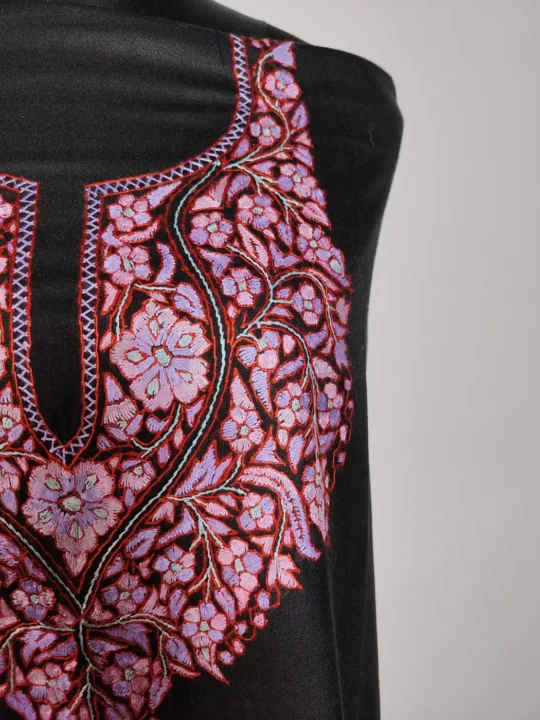 A soft black base and delicate hand sozni paper machie florals at the neckline give this Kashmiri unstitched 2pc suit its charm. Crafted in summer cool cotton, it includes salwar kameez fabric, which has been left unstitched so that you can tailor the fit and style exactly as you like.