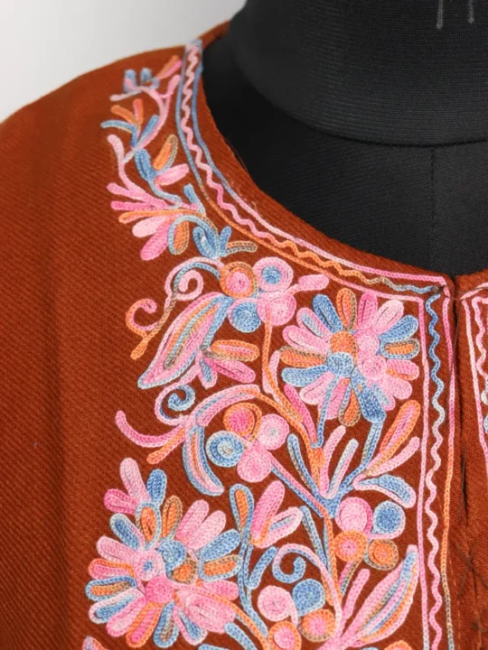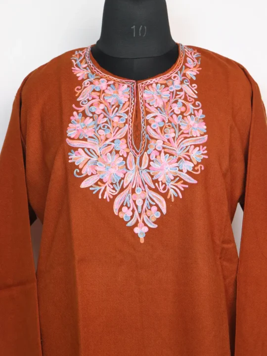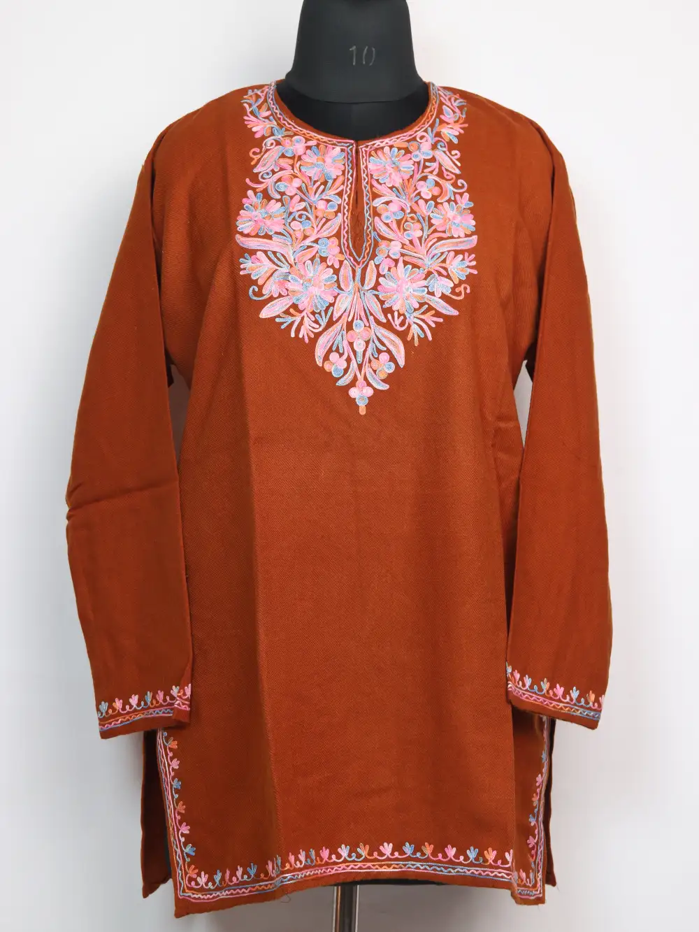 Beautiful short kurti in brown hue crafted from Cashmilon wool with Aari embroidery at the neckline in tiny badam patterns and pockets kept both side for practical wear. The kurti balances neat neckwork and wearable fabric.