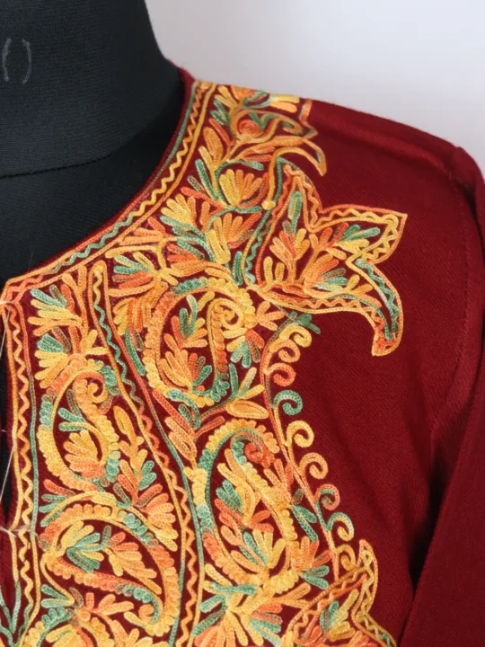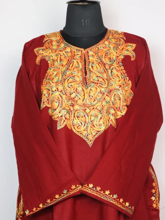 Woven in cashmilon wool, this maroon pheran Mehrun carries floral Aari embroidery arranged neatly at the neckline. It includes pockets on both sides which enhance its convenience.