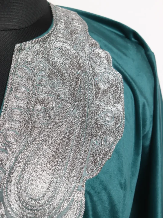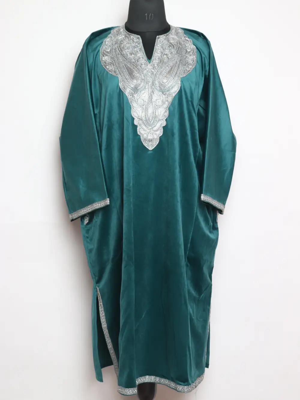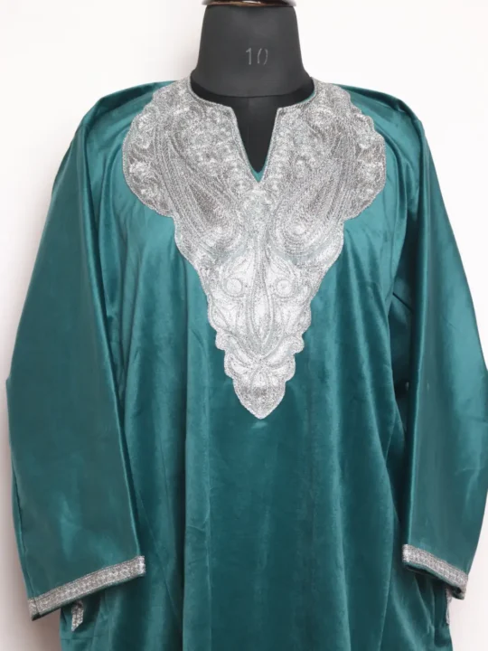 Made from lush holland velvet in green with floral badam motifs that is worked at the neckline in Zari Tilla, this sea green colour Kashmiri Pheran brings soft evening warmth. Its chest size 54 inches and length 44 inches give it a roomy fall.