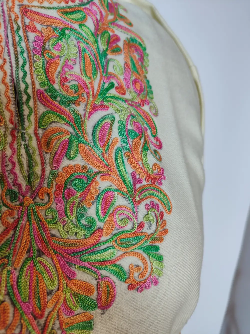 This white colour Kashmiri phiran is shaped in cashmilon wool with floral aari embroidery lighting up the neckline. It holds Kashmiri warmth effortlessly, tailored with chest size 36 and length 24 inches for a comfy, graceful fit for young girls.