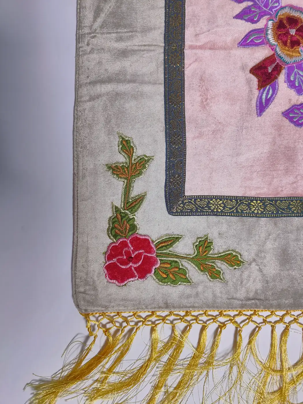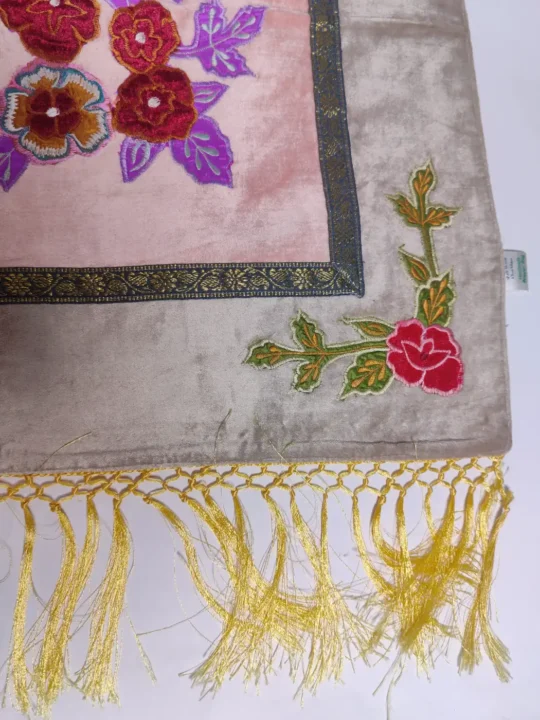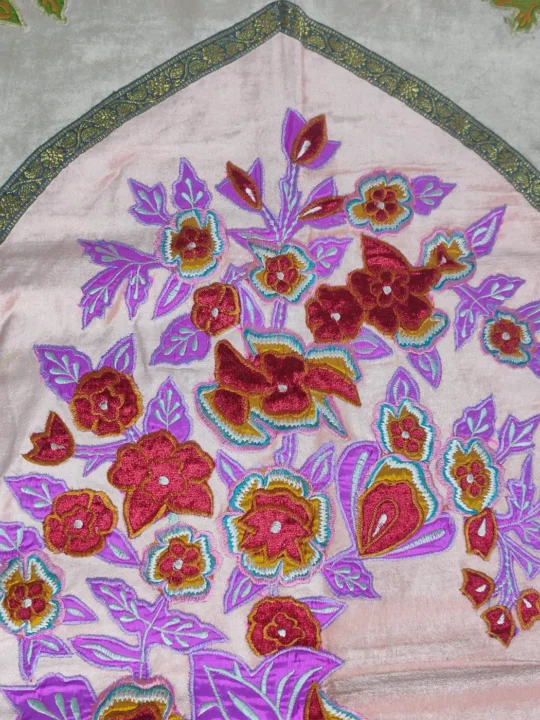 A graceful mehrab arch frames delicate floral embroidery flowing across the center of this prayer mat. Crafted with a soft velvet front and dasoot cotton backing in white, the threadwork enhances its elegance, making this prayer mat a serene and refined offering for devotion.