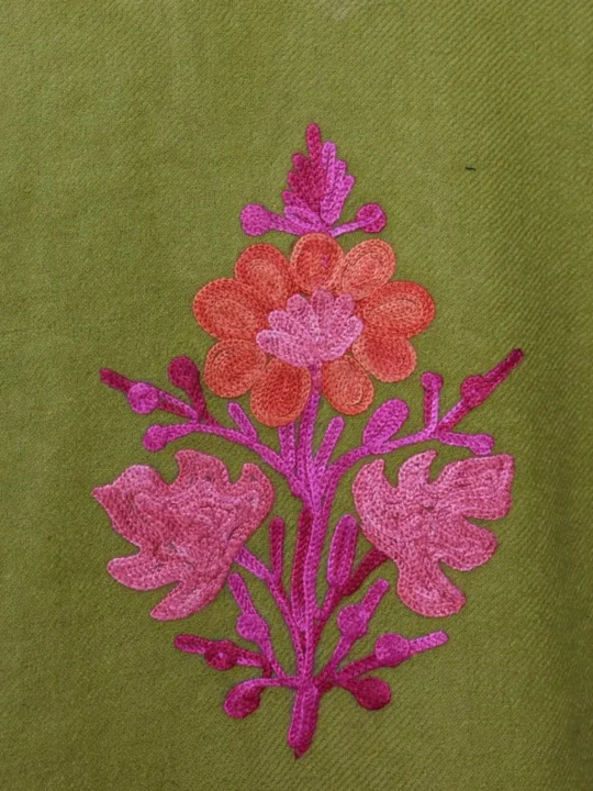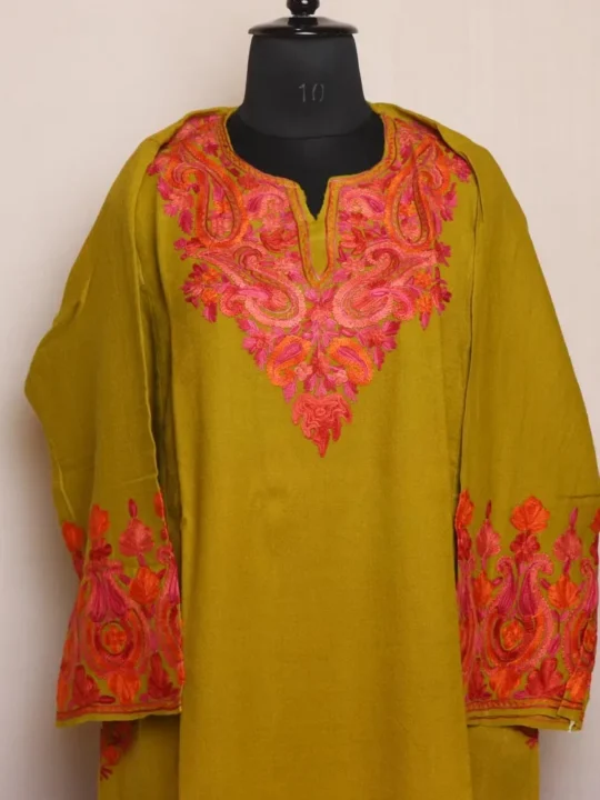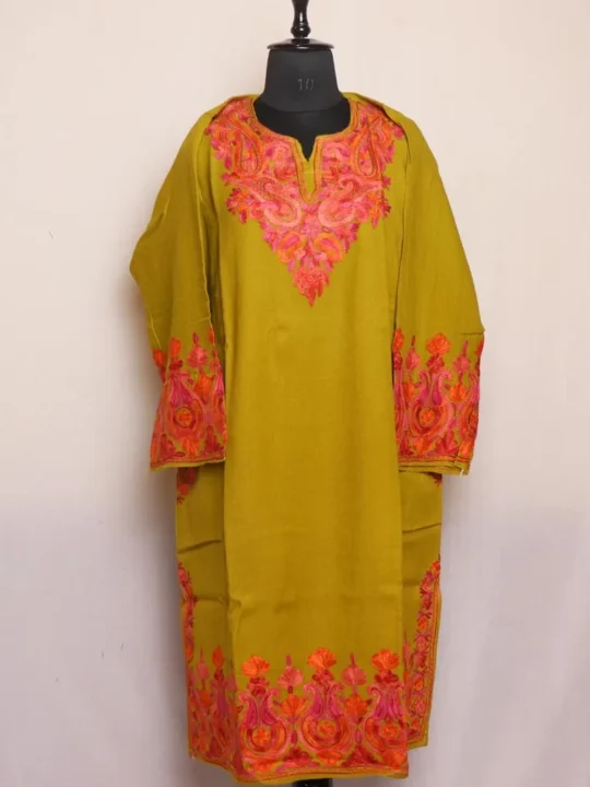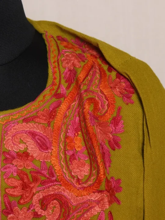 Step into tradition with this mehndi green raffal pheran. With a lovely mehndi green shade, this pheran shines with intricate Aari work, lovingly stitched by Kashmiri artisans. It’s a warm, cozy piece that’s perfect for cold days and adds a dash of grace to any occasion. Simple, yet made with great care, it brings out the spirit of Kashmir.