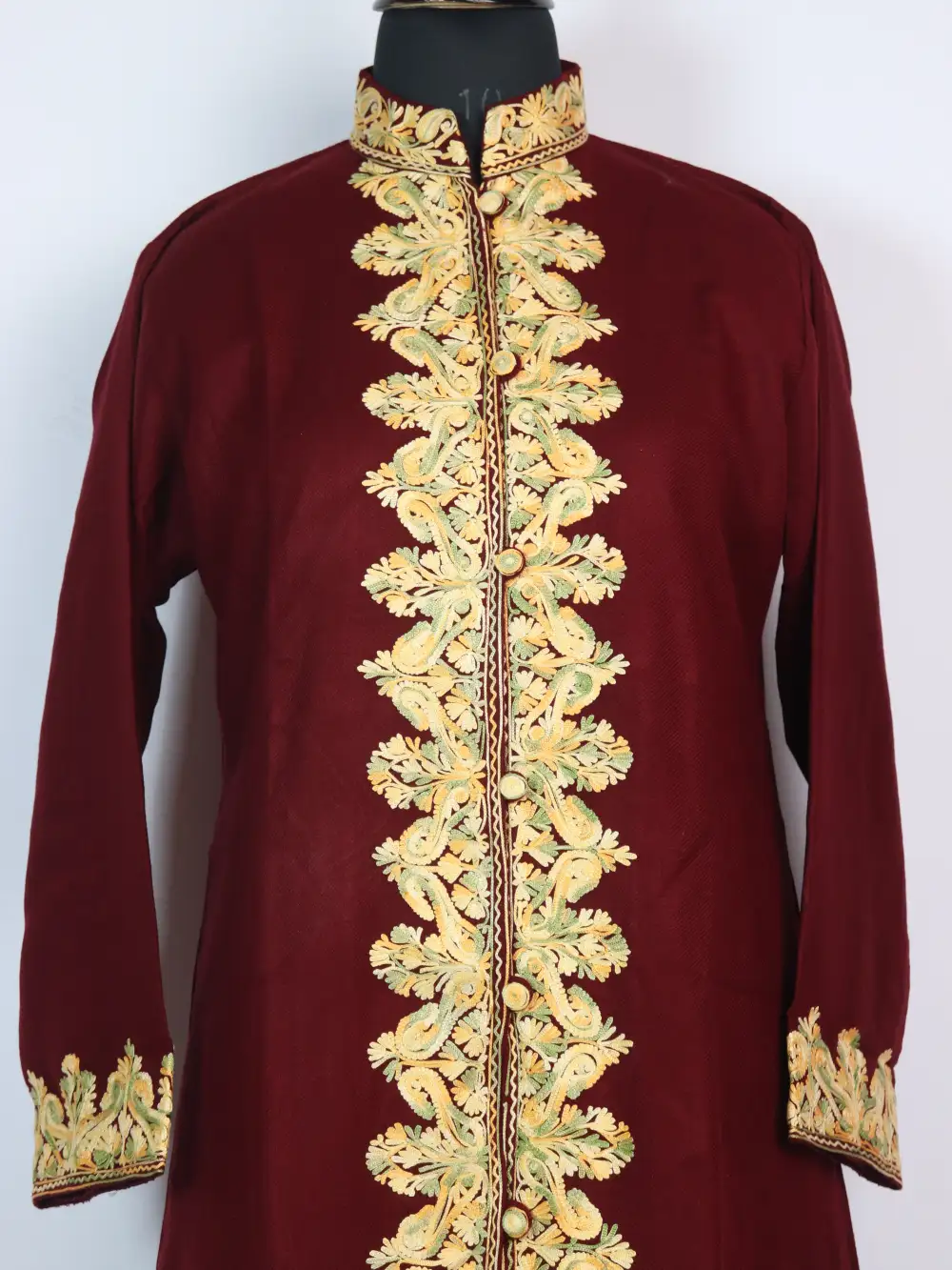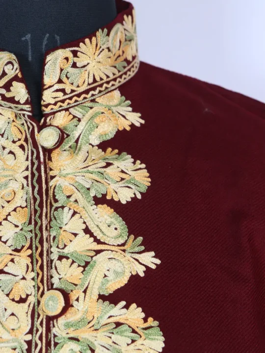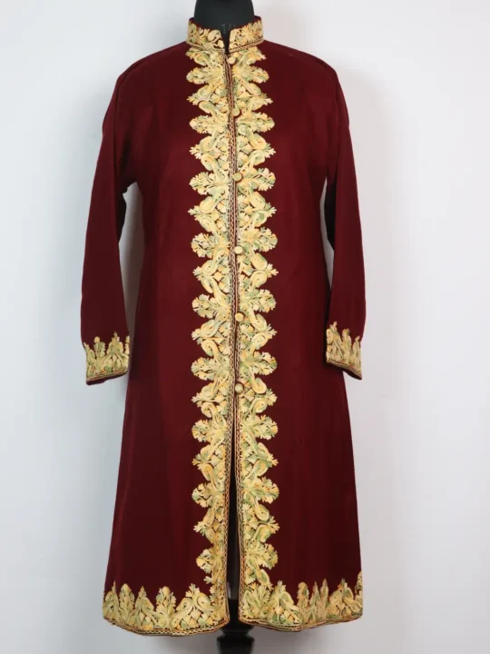 Measuring 42 inches in length, this Naaz coat which is crafted from maroon Cashmilon wool provides gentle warmth for winter wear. Green and yellow badam motifs which are embroidered across the borders add it a soft decorative touch. It comes with lining for comfort, and the coat allows easy layering. It is light yet cozy, the jacket combines elegant embroidery with practical warmth, which makes it a refined winter essential.