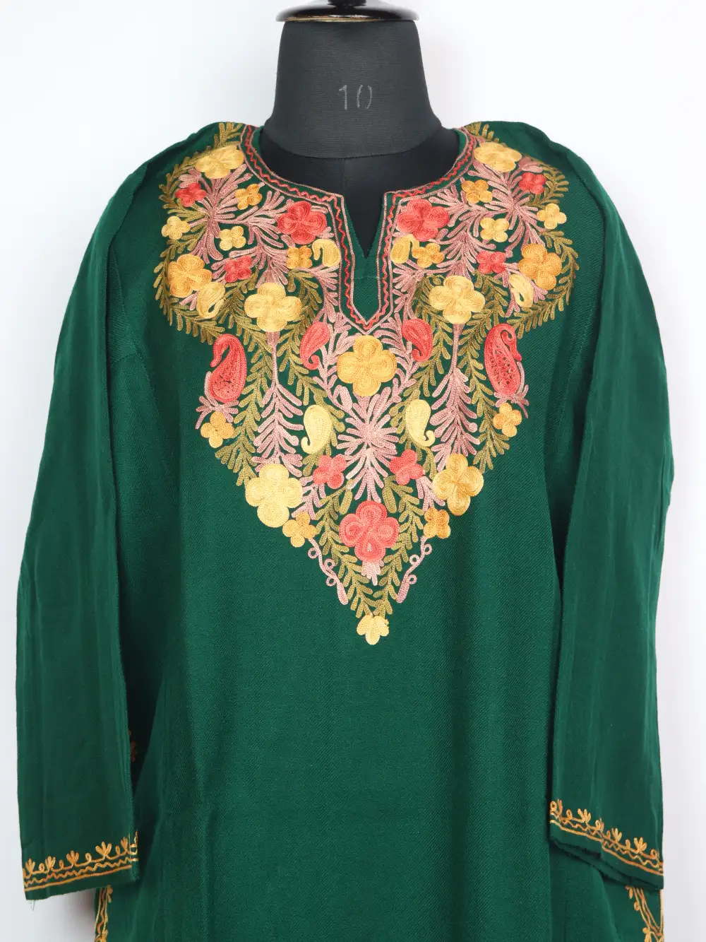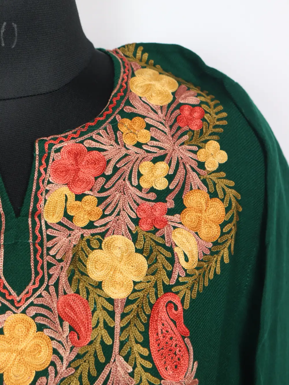 Cashmilon wool phiran dress in green colour carries Aari work at the neckline where stitched floral motifs create a decorative crown. Its chest size 54 and length 43.5 inches provide a roomy fit.