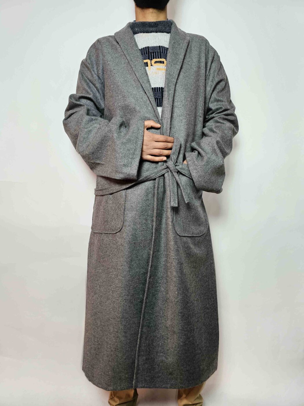 Woven from tweed in a rich grey tone, this plain Bathrobe or gown offers roomy comfort. This Bathrobe features two pockets on the front sides and it comes in 56 inches chest size by 50 length, which makes it effortless to wear around the house or over layers. At 2899, this piece balances value and refinement; it carries a faint Kashmiri mood in its simple finish and warm, textured fabric.