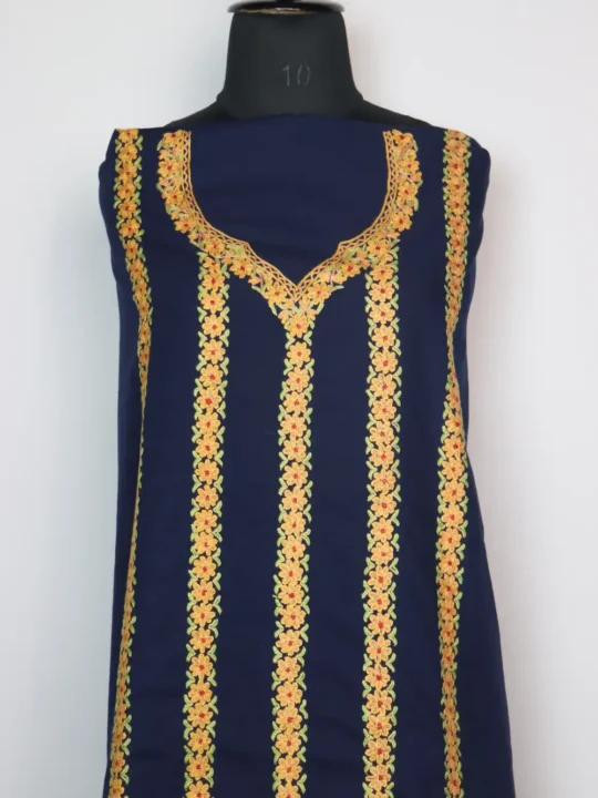 This elegant Midnight Blue unstitched spun fabric suit comes in floral neckline Hand aari embroidery paired with matching golden long floral line patterns at the front that give it a classic and graceful look. The 2-piece set includes kameez and salwar for custom stitching.