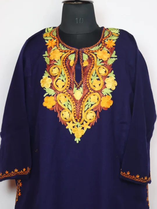 Designed from cashmilon wool for cold seasons, this Kashmiri faran appears in midnight blue colour. Its aari embroidery in badam patterns adorns the neckline.