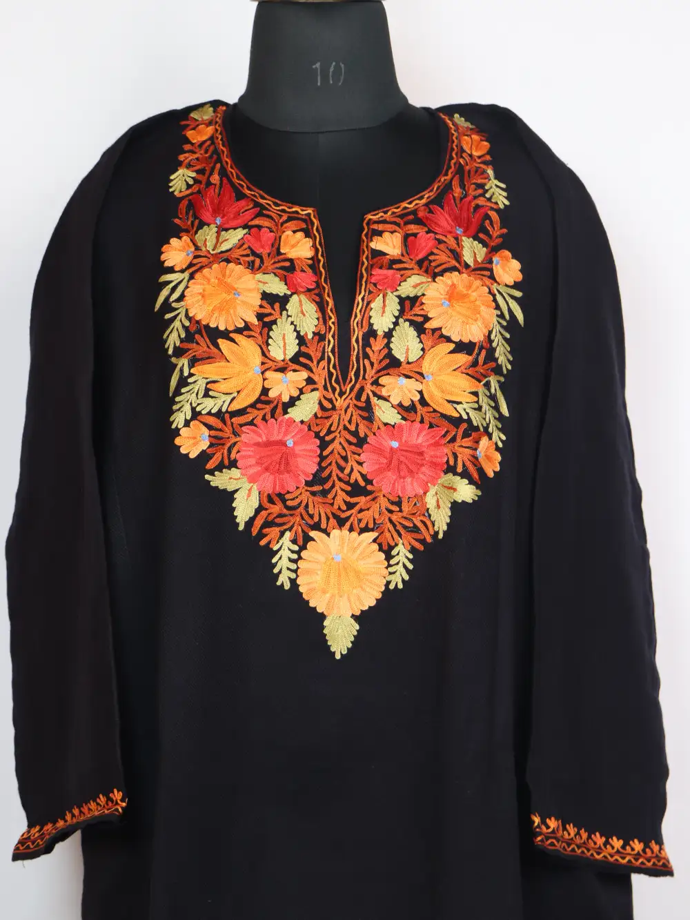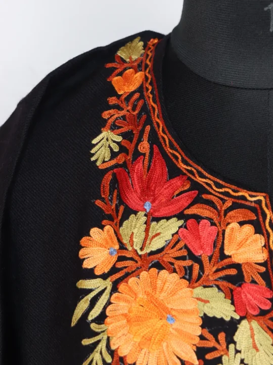 A black colour Kashmiri feran in Cashmilon Wool carries Aari kadhai at the neckline and it has pockets both side for useful wear. It is perfect for family evenings and small gatherings