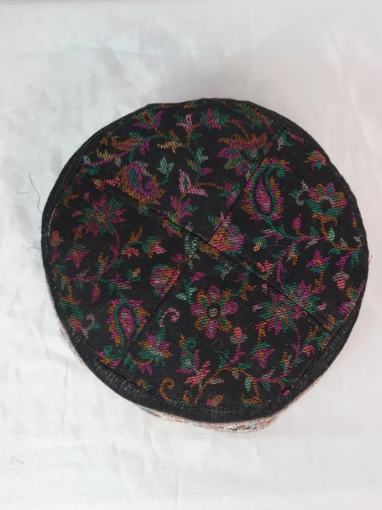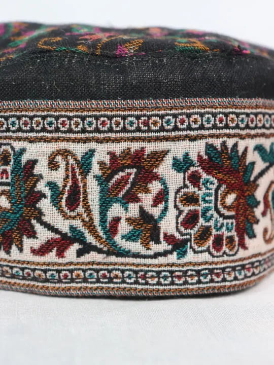 22 size topi made with Kani Shawl, decorated with a floral top and continuous floral motifs across borders. This premium Kani Cap represents Kashmiri artistry and is perfect for gifting or adding elegance to any outfit. Its lightweight design ensures comfort while maintaining a rich, traditional appearance.