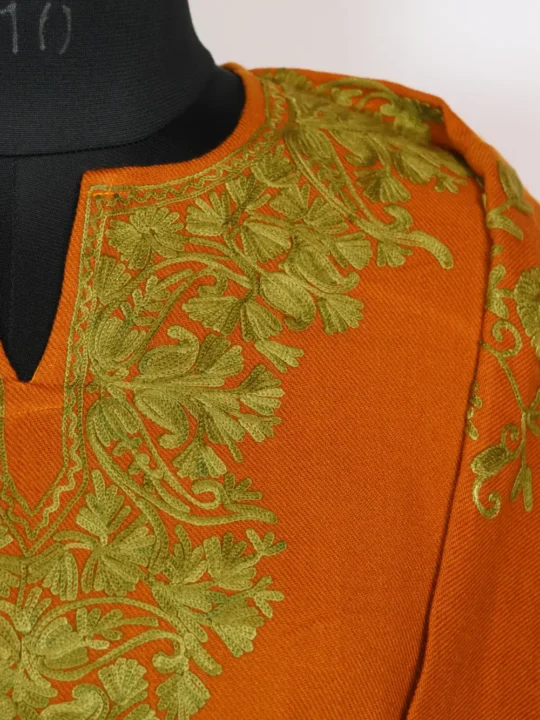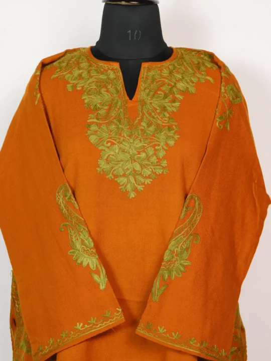 A rich mustard Cashmilon wool feeran detailed with badam floral design at the neckline, jaal pattern at side panels and booti type floral at sleeves- all done in green hue threads. It offers a calm winter layer sized to a 50 inch chest and 41 inch length. Pockets on both sides add utility to the comfortable drape. This dress keeps styling simple and refined, from our pheran online collection this piece reads ready to wear — you can buy this phiran dress whenever you want a neat Kashmiri finish.