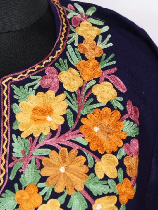 Soft, warm, and easy to wear this navy blue Cashmilon pheran is perfect for winter season. It features Aari floral embroidery on the neckline in many tones. It has a chest size of 52 inches and a length of 43 inches.