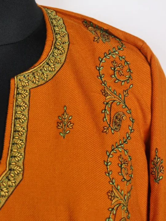 Made in cashmilon wool this Jashn-e-Rekhta Kashmiri feran shows Sozni embroidery in continuous lakeer and booti style work all over the front panel and neckline.