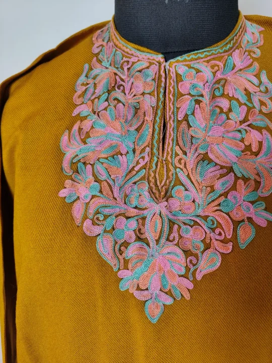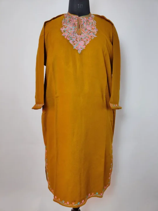 This yellow pheran feels soft to the touch, it is crafted in cosy Cashmilon wool fabric. Its neckline blooms with green-pink floral Aari embroidery that adds quiet elegance. Sized at 40 inches, it fits with ease and grace. It is available at ₹1299 which makes it an affordable, charming option for those who like simplicity woven with beauty.