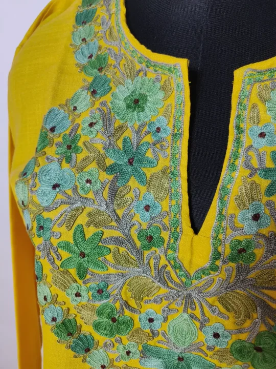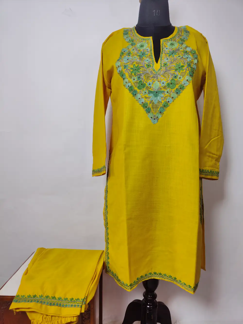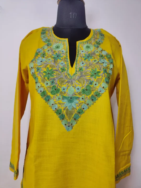 Made from ruby cotton, this mustard color kurti set offers comfort and subtle elegance. Blue and green shaded floral and vine motifs at the neckline, done in Aari work, makes this design stand out. The coordinated top and bottom ensure a graceful look while being easy to wear for everyday use. With its balanced touch of artistry and practicality, this set becomes a dependable choice for women who value style with ease.