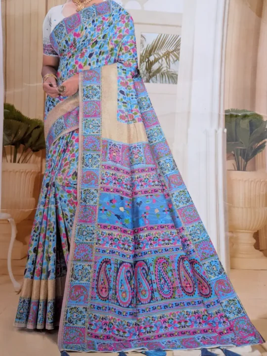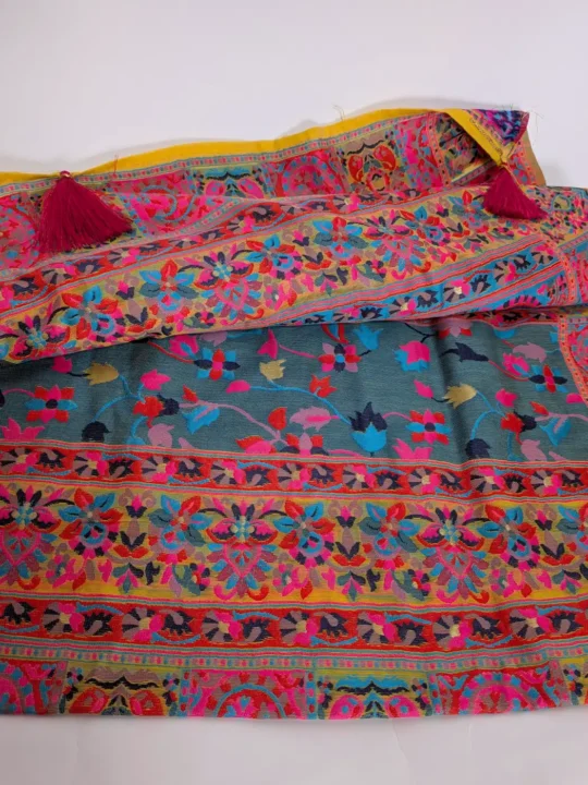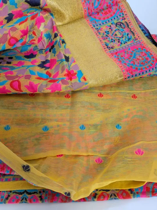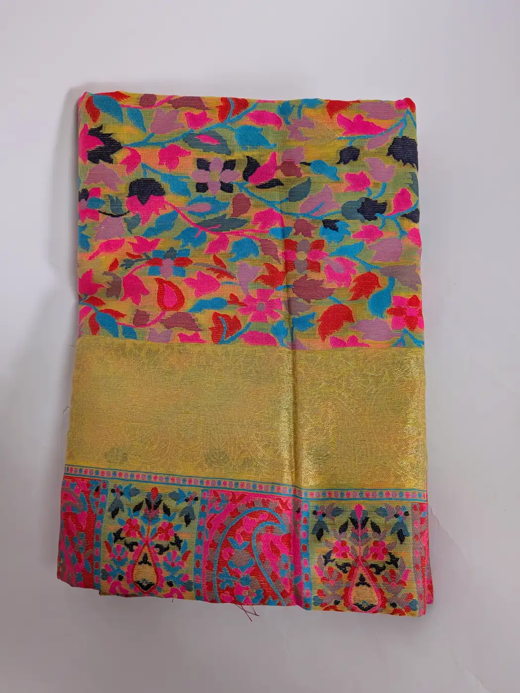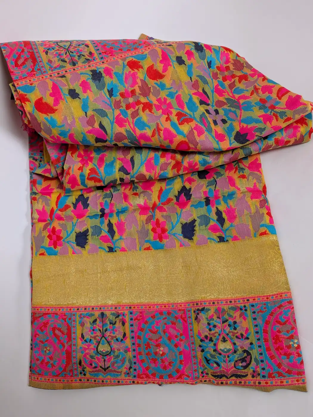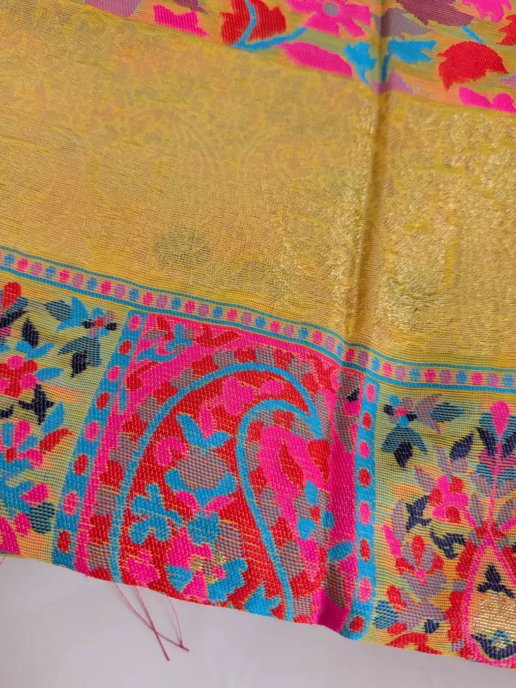 This designer saree in mustard cotton silk become extraordinary through its Kani weaving. Its intricate floral patterns extend all over the saree, complemented by a badam design border that enhances its richness. Balanced and graceful, it carries the warmth of Kashmiri tradition beautifully.