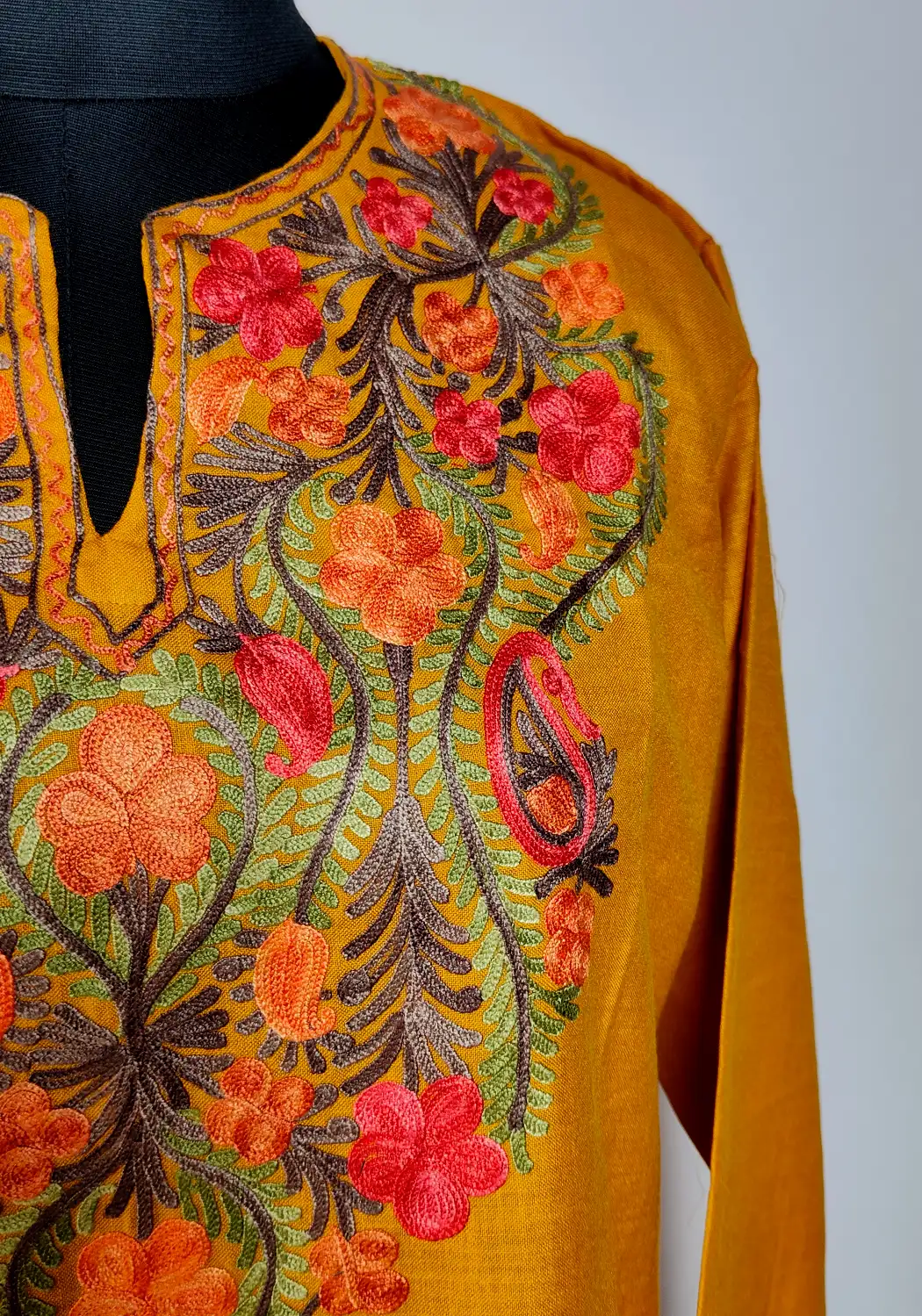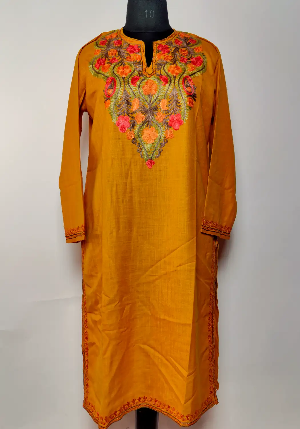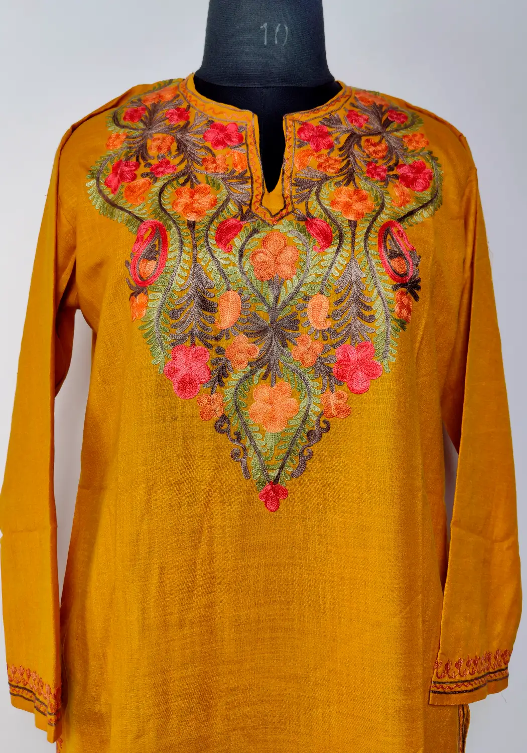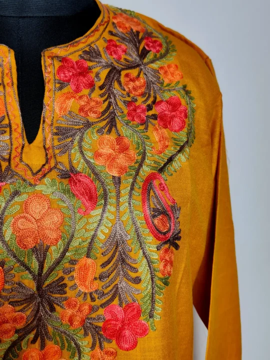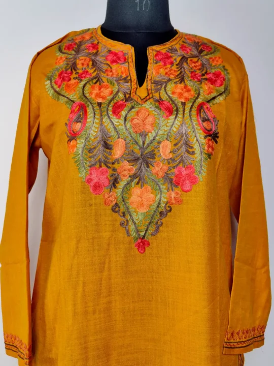 Curved floral aari embroidery gently highlights the neckline of this aari brand kurti. Crafted in mustard ruby cotton, it carries a smooth and comfortable fall. The overall look stays minimal, which makes it a timeless piece you can wear without overthinking.