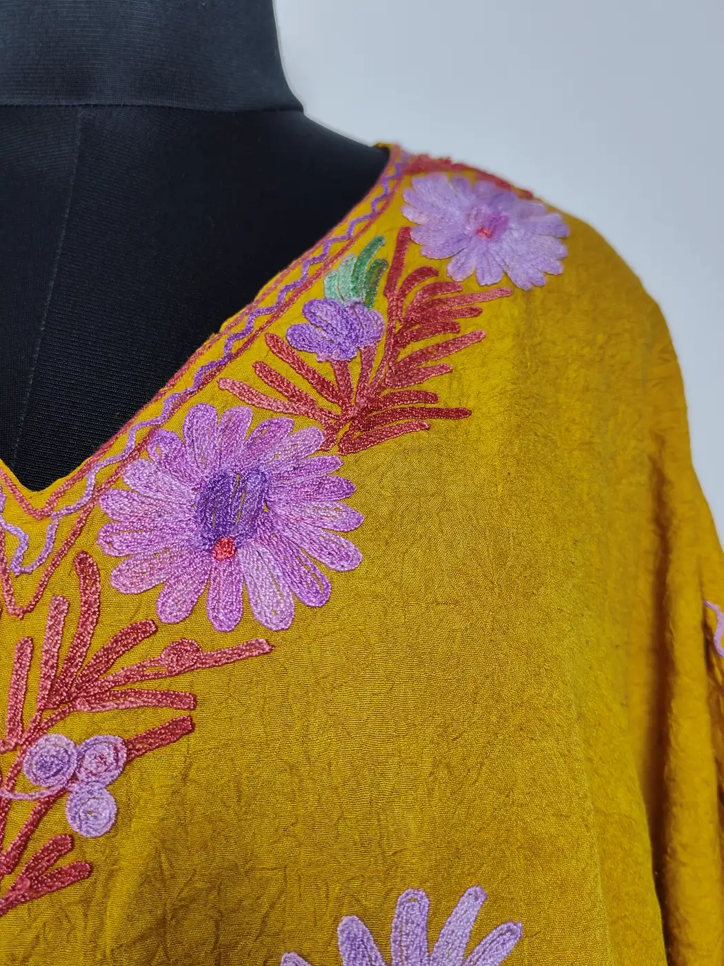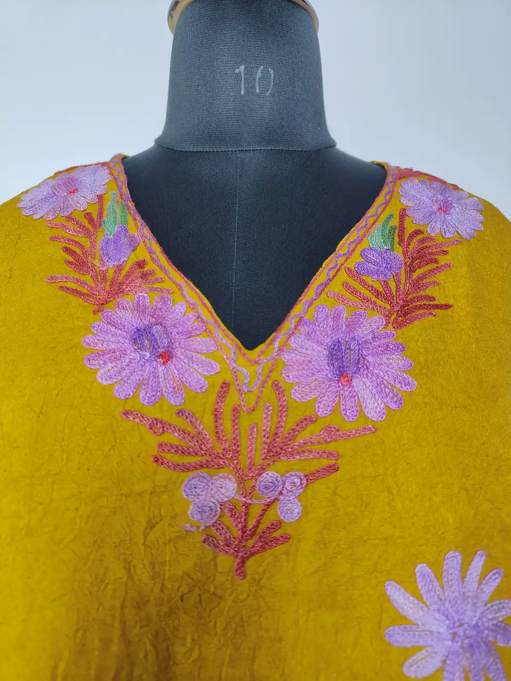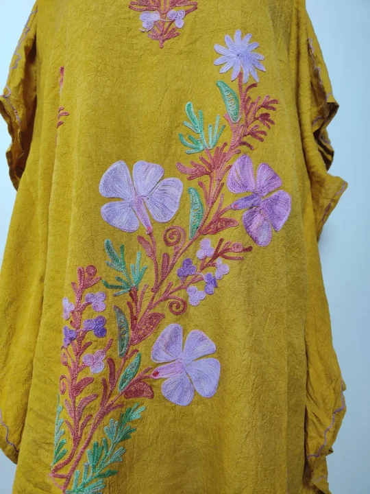 Designed for comfort, this Kashmiri aari work kaftan is made for women, It comes in breathable mustard crush cotton. Floral embroidery especially at the front panel draws attention without overpowering, while the relaxed fit keeps it easy to wear, offering a simple yet refined traditional look.