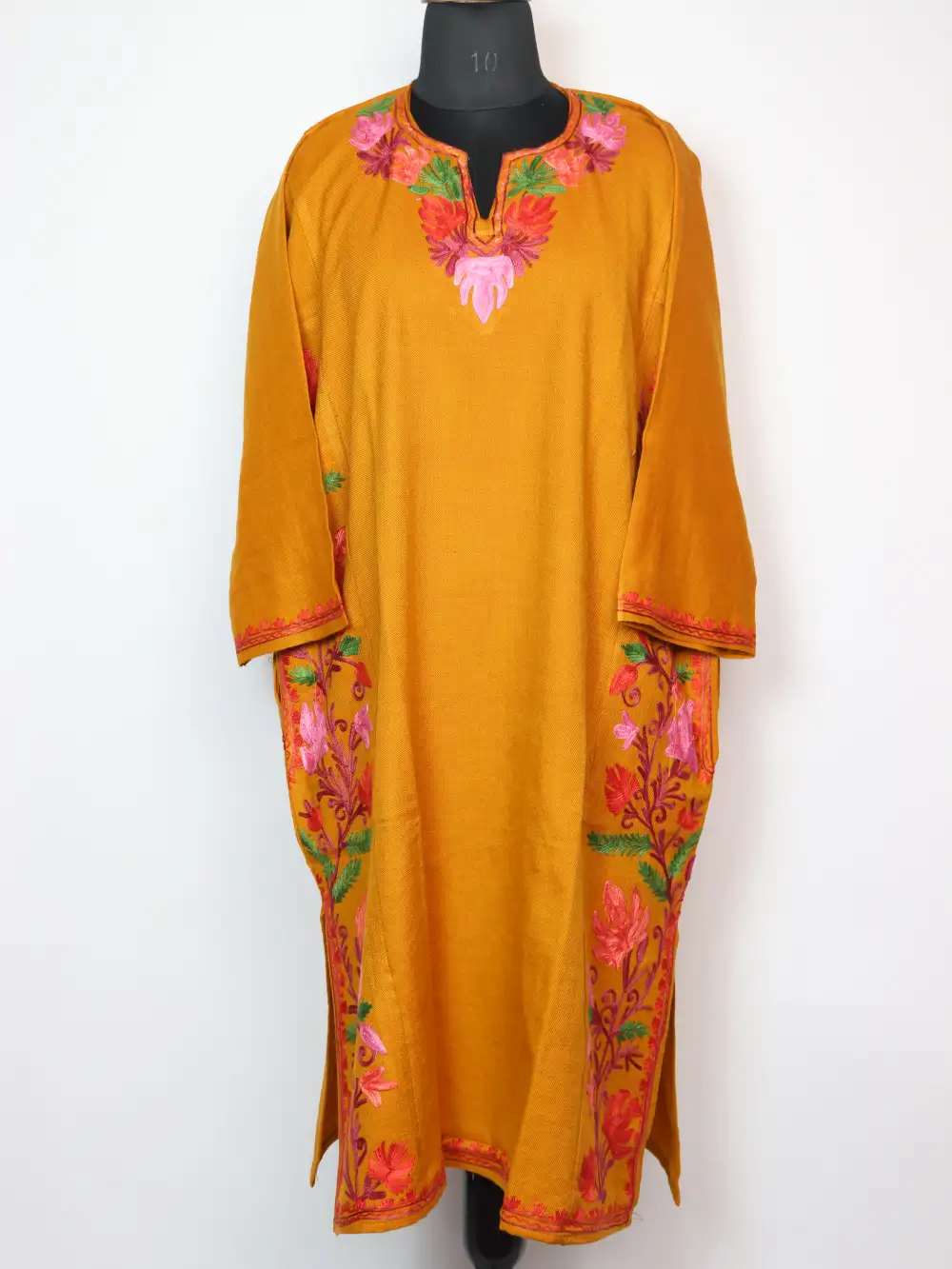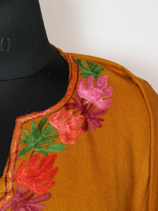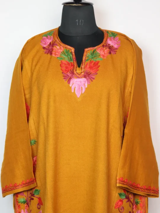 Cashmilon wool forms this phiran dress in mustard colour. It is detailed with Chinari patterns on neckline and side panels. It includes pockets on both sides add practical ease.