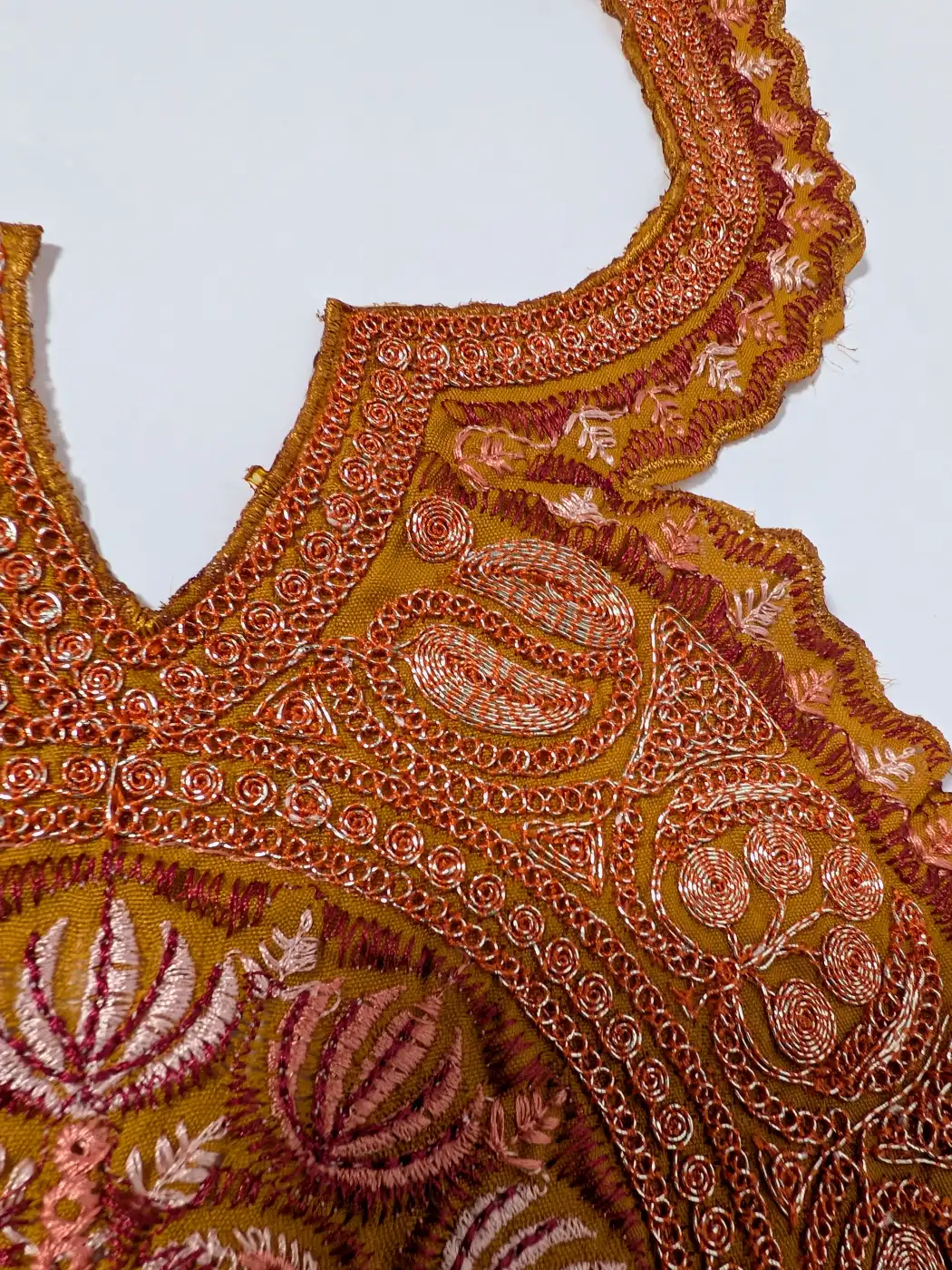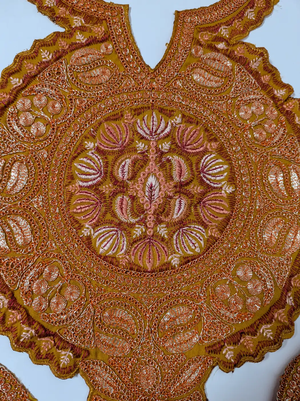 Crafted on a deep mustard base, this round patch set carries silver tilla embroidery that highlights floral and continuous badam patterns on the neck and sleeve patches. The lace features continuous detailing, gives it a refined traditional appeal that works beautifully when assembled together.